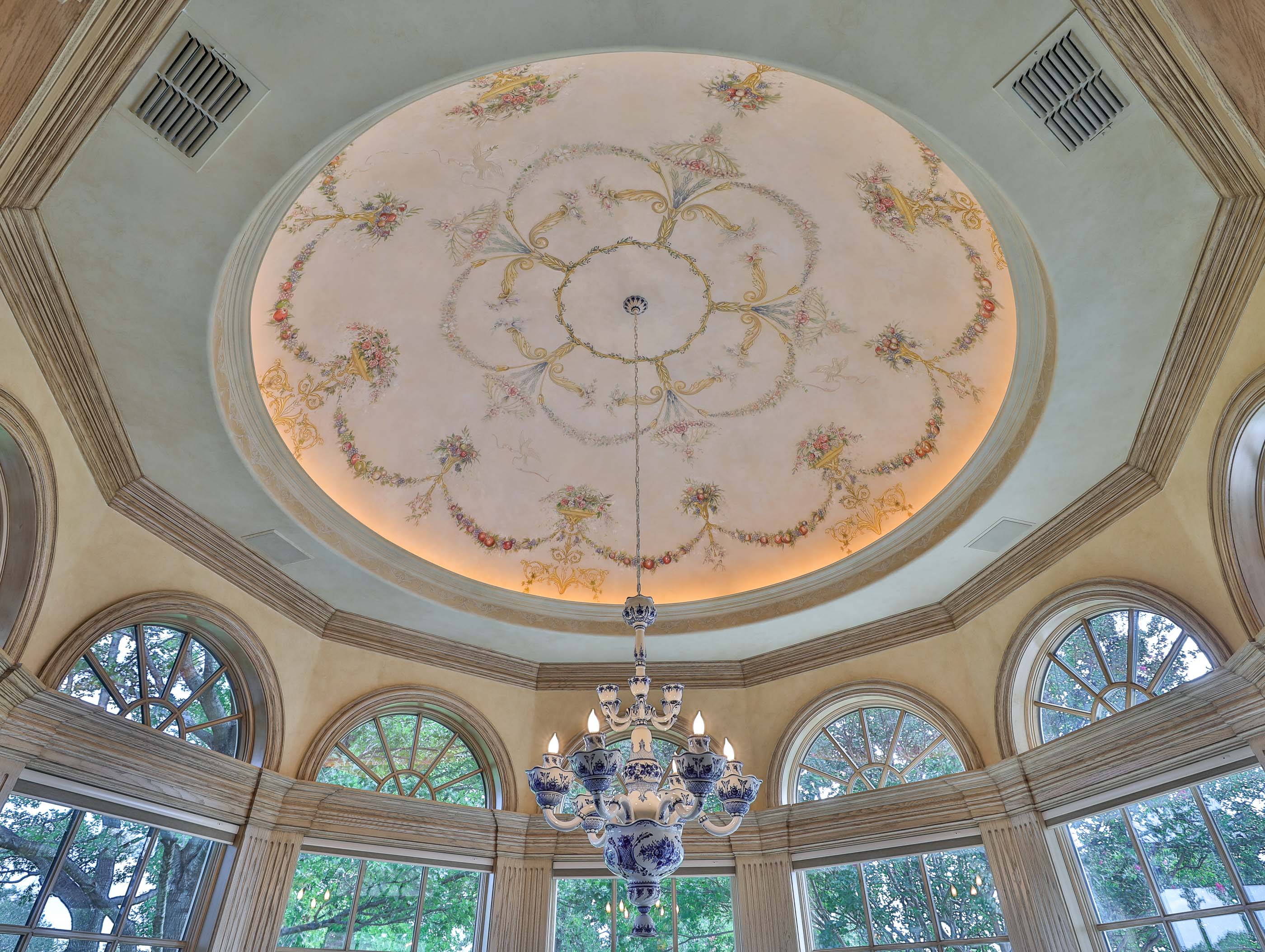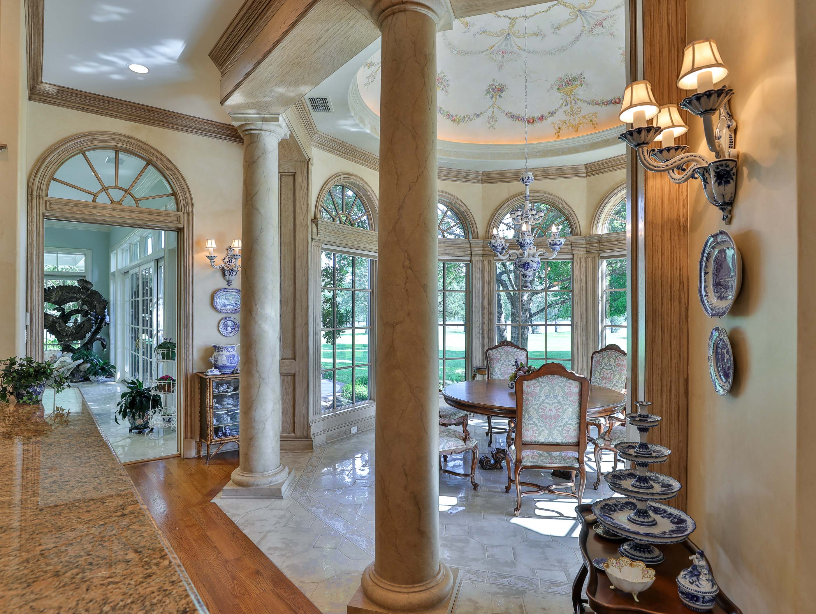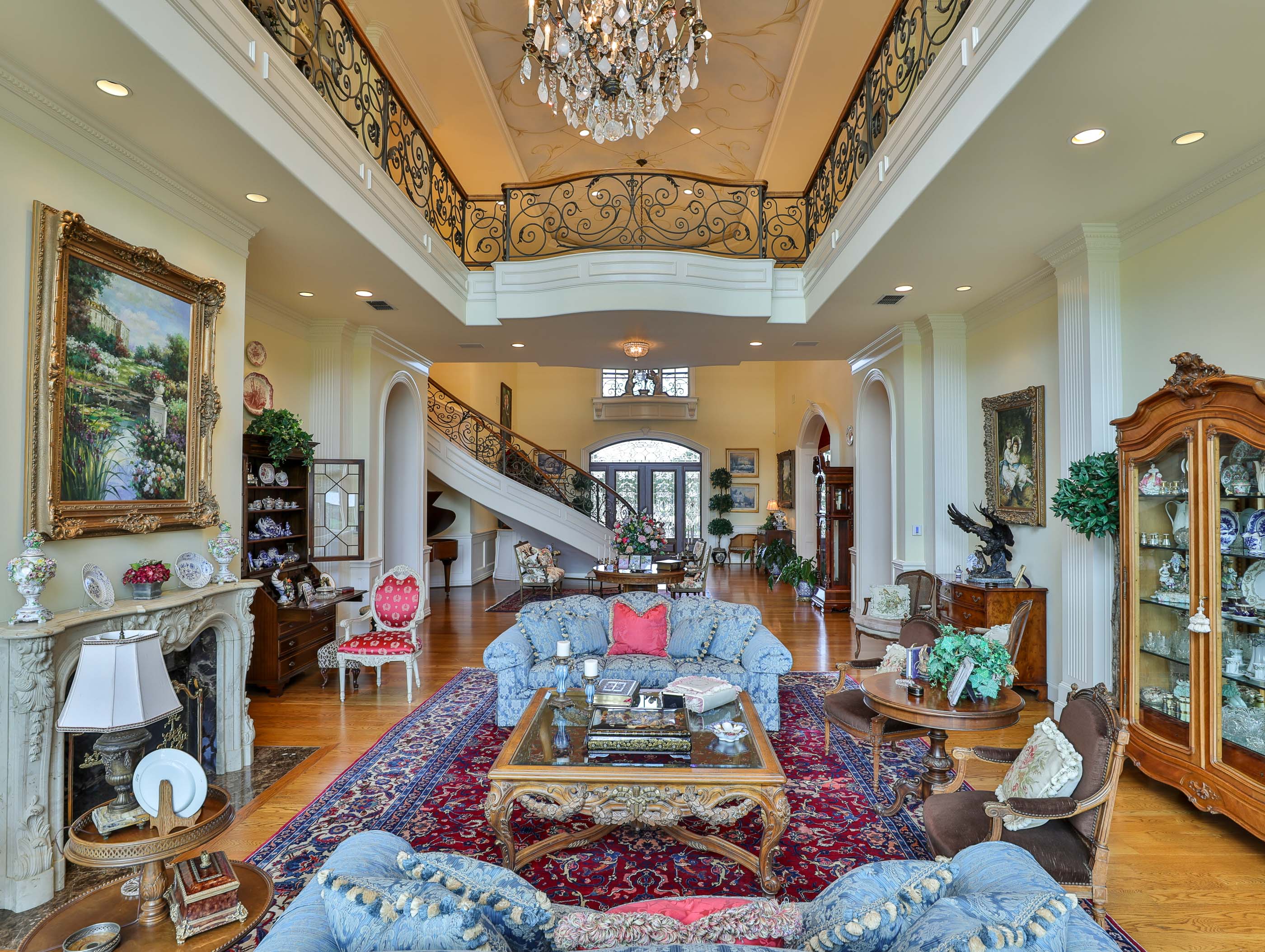 The colonial architecture was accented with large cast stone columns, gable façade, window and door surrounds, and featured special shaped brick. The foyer has a floating stairway, open balconies, a hand painted barrel ceiling with custom crystal chandeliers. Cabinets, woodwork, and all interior details were designed by building designer and construction manager Ron Parker AIBD. Ron’s wife, Lila Parker ASID Interior Designer, worked with the client and her associates on all interior selections, fabrics, and draperies.