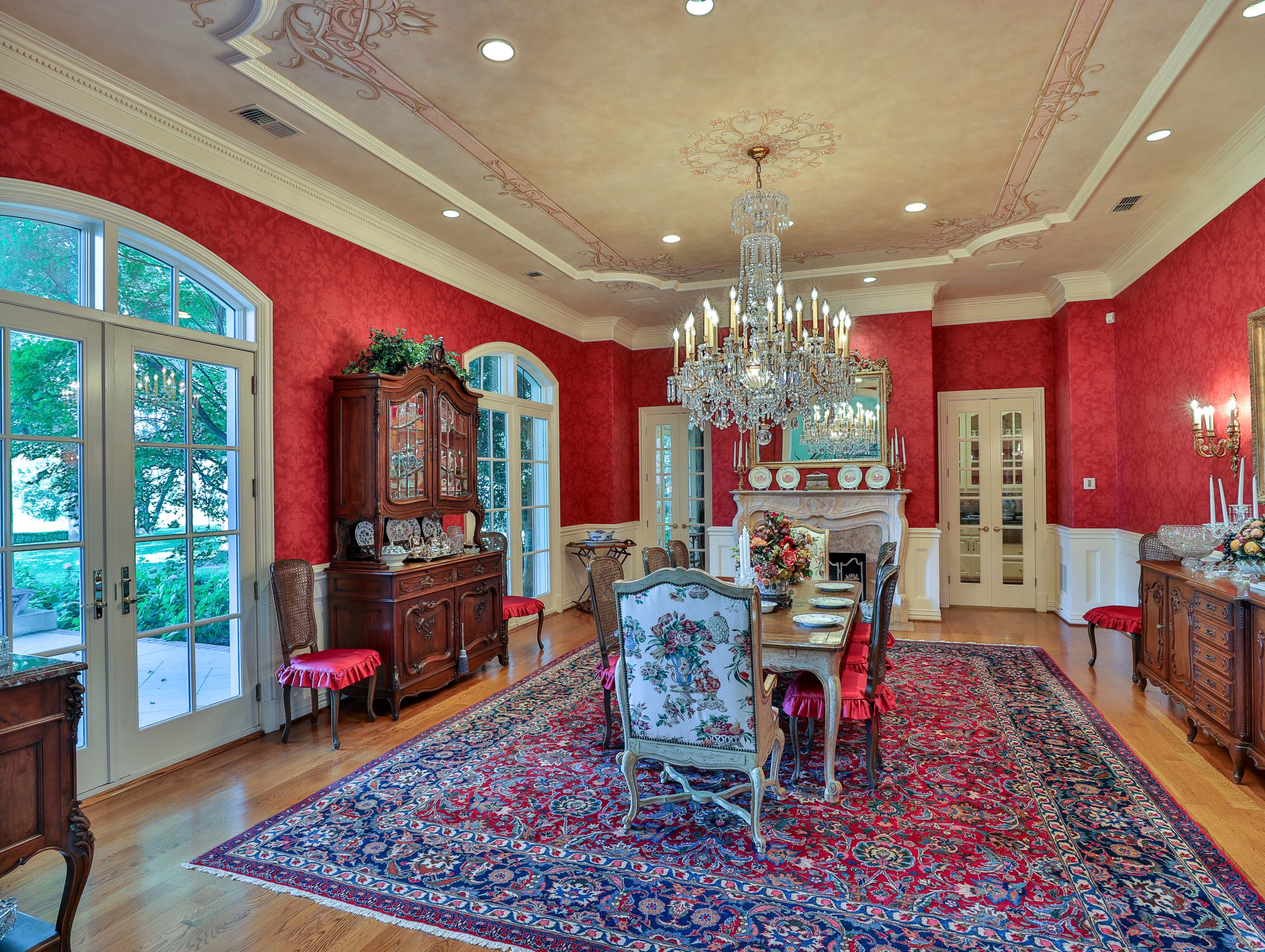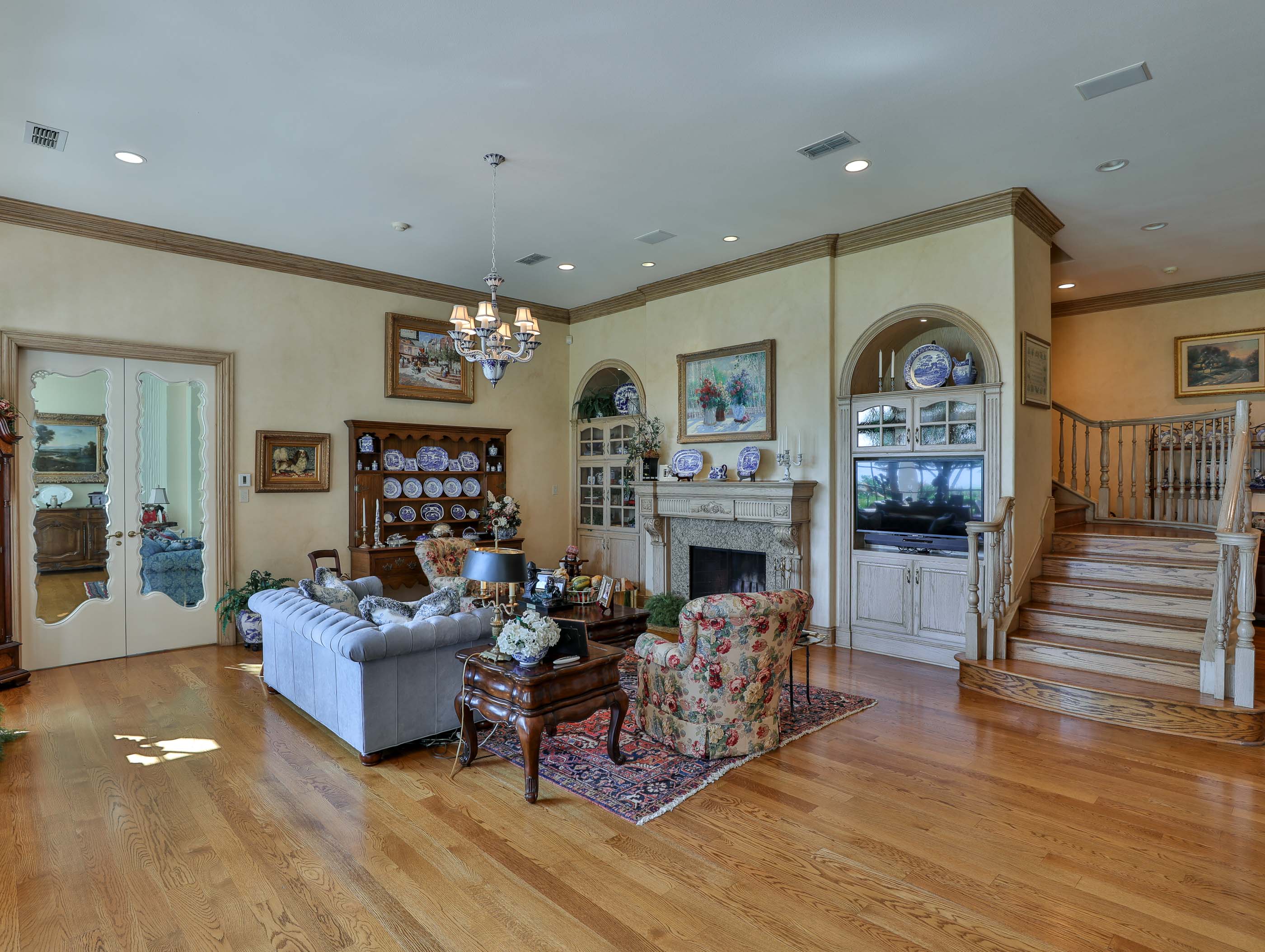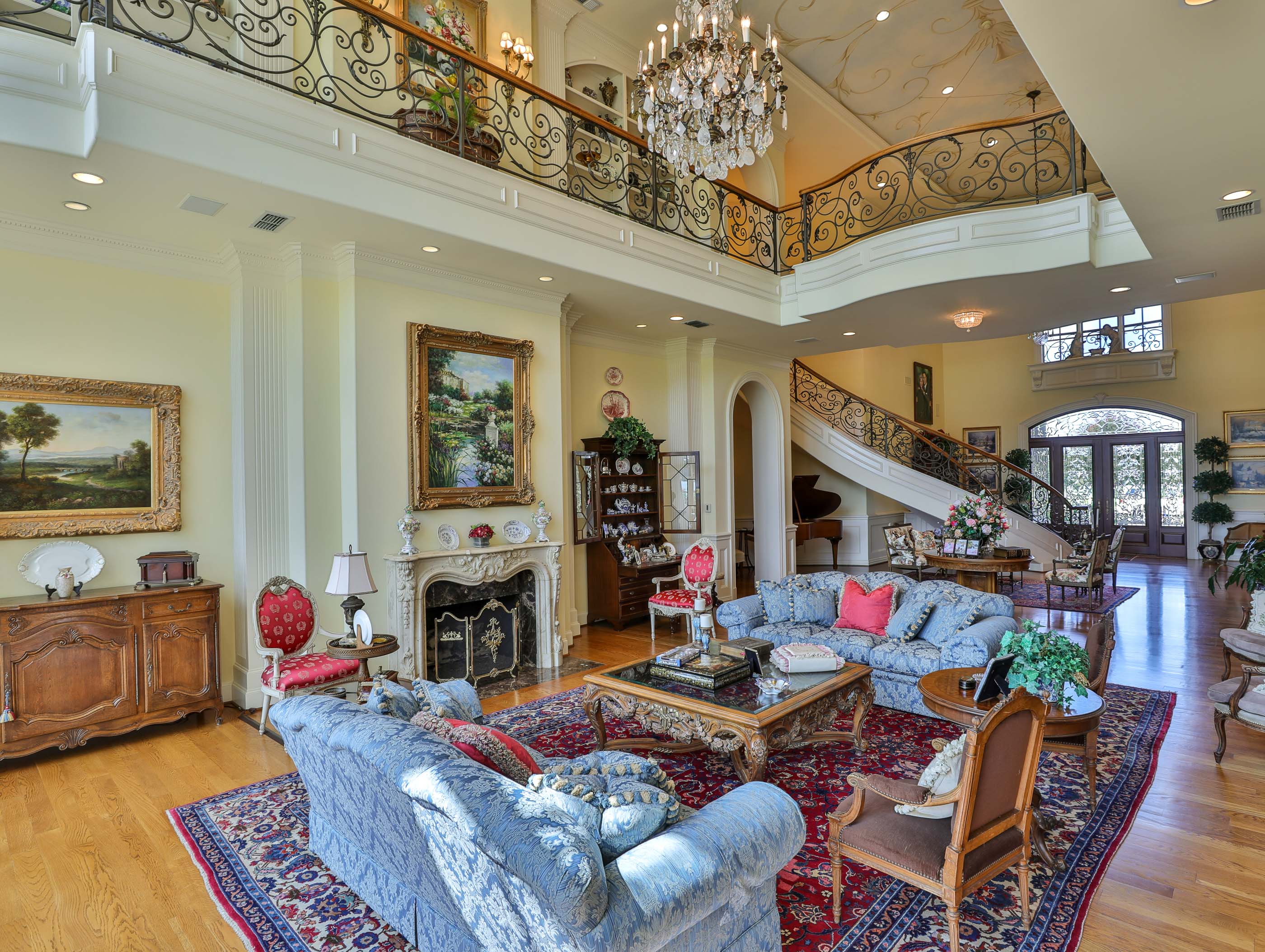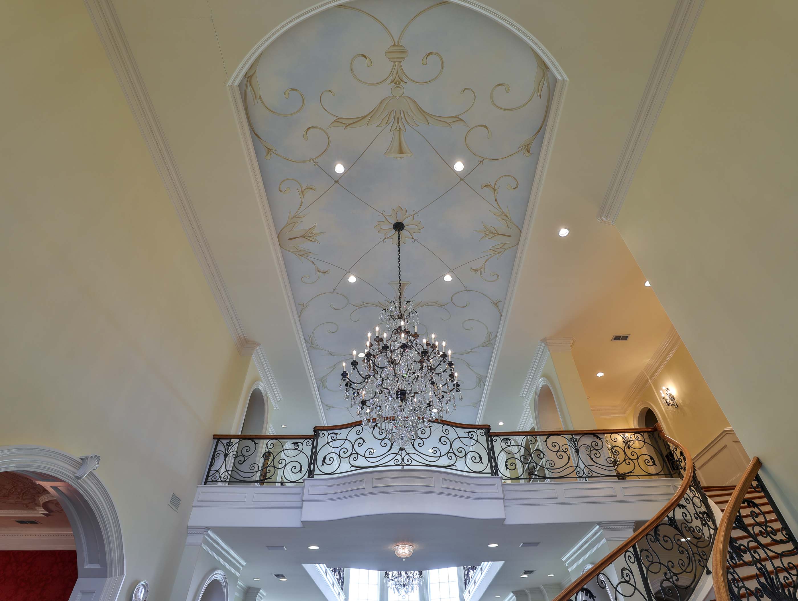The colonial architecture was accented with large cast stone columns, gable façade, window and door surrounds, and featured special shaped brick. The foyer has a floating stairway, open balconies, a hand painted barrel ceiling with custom crystal chandeliers. Cabinets, woodwork, and all interior details were designed by building designer and construction manager Ron Parker AIBD. Ron’s wife, Lila Parker ASID Interior Designer, worked with the client and her associates on all interior selections, fabrics, and draperies.