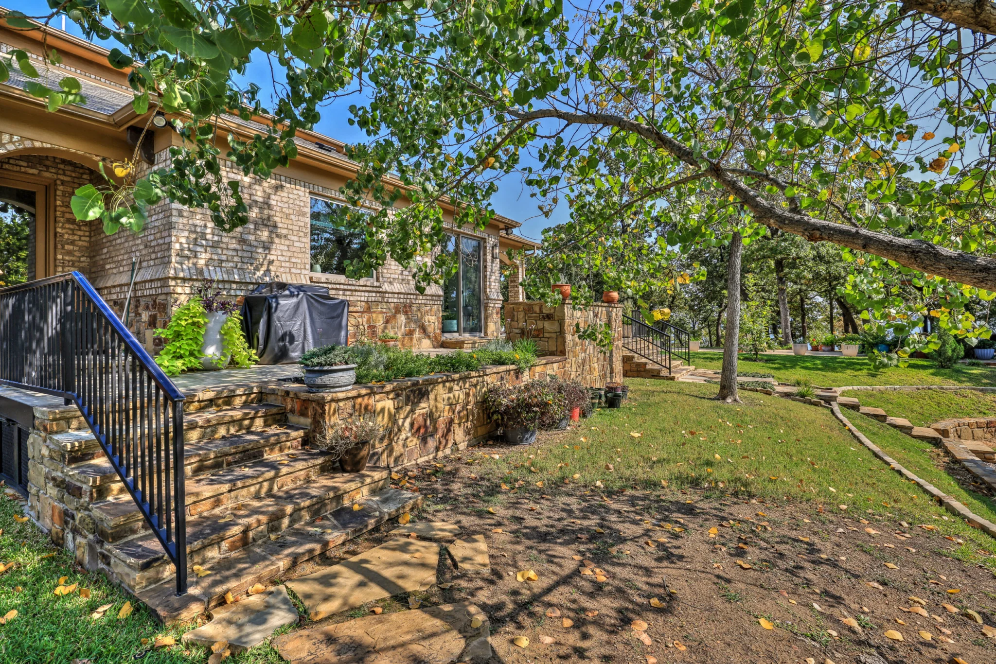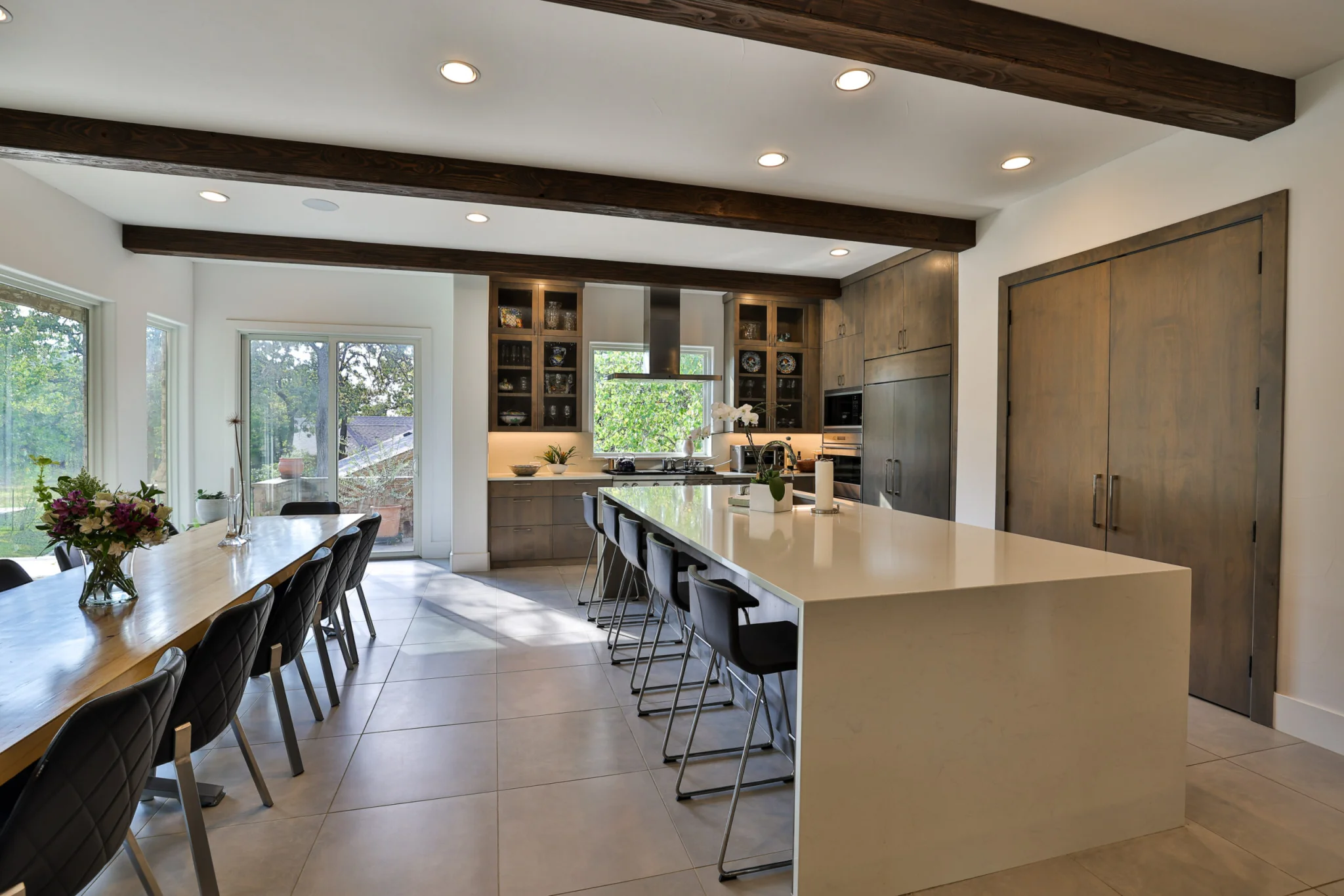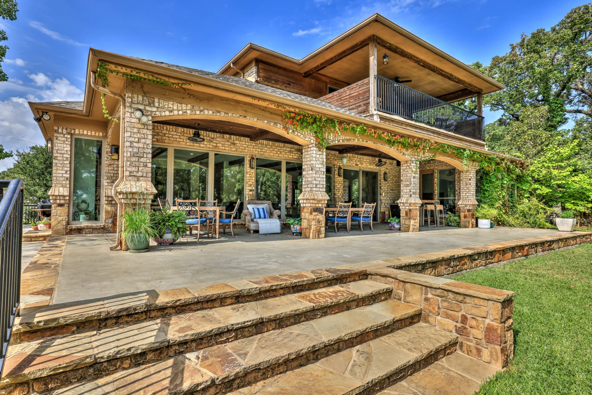 Additions were created to expand the Kitchen and Dining Area overlooking the lake. A beautiful European style kitchen was designed to include flush inset and stained cabinets; quartz counters with “waterfall effect’ at the island and serving bar”; significant cabinet and storage details; large and expansive Andersen Windows and Patio Doors, custom wood beams, and oversized porcelain tile flooring. The Family Area was redesigned with a custom entertainment center, and new Andersen Doors and Windows. Other remodeling and interior design upgrades were completed in the home including converting the existing Dining Room and Butler’s Pantry into a Library and Reading Area, and remodeling the Powder Room to include a free-standing contemporary vanity. Changes and upgrades were also made to the Study, and Master Bath. A large patio was built with stone retaining walls, borders, planters, and steps leading to the terraced yard.