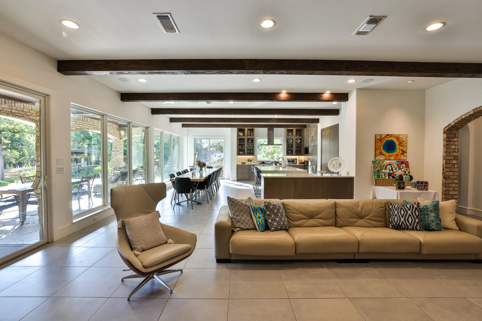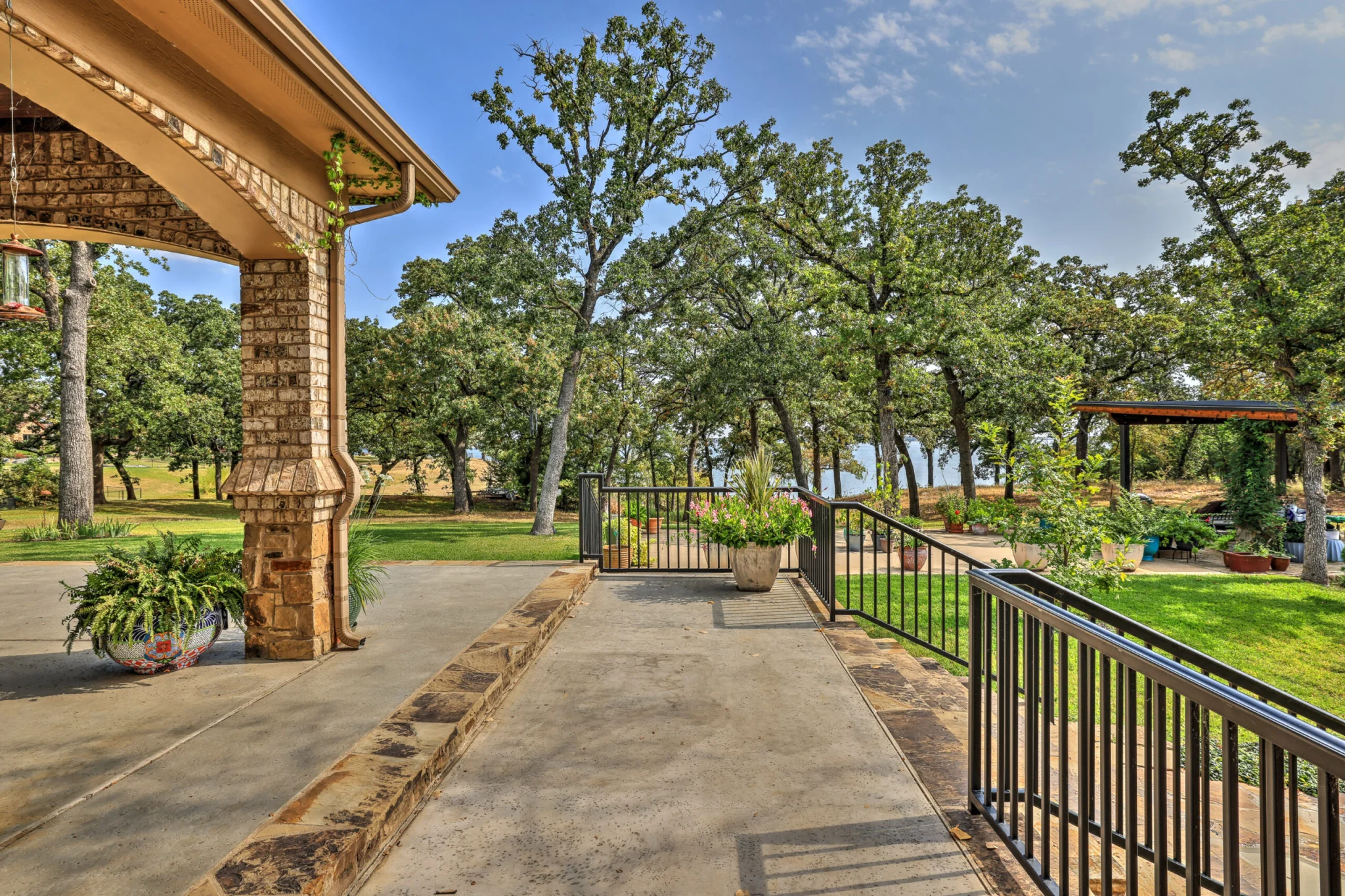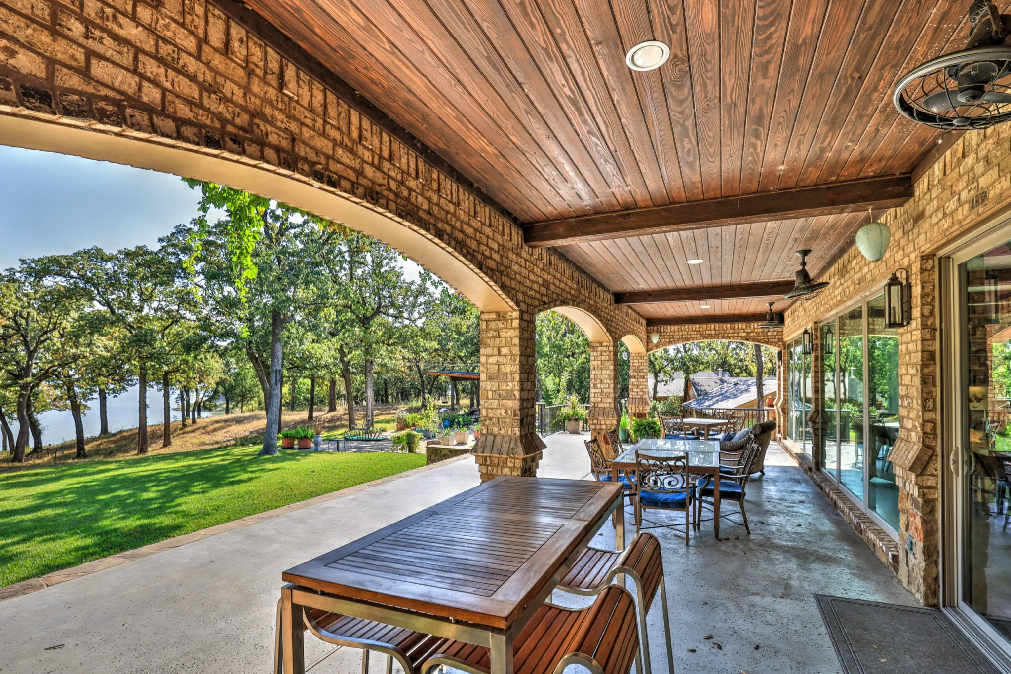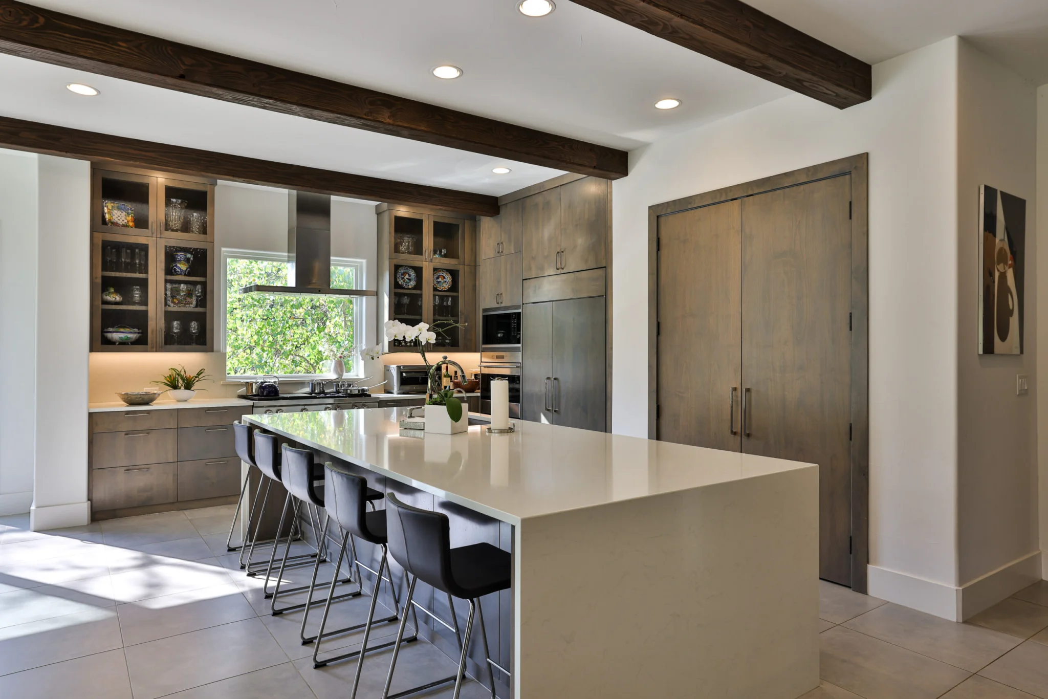 Additions were created to expand the Kitchen and Dining Area overlooking the lake. A beautiful European style kitchen was designed to include flush inset and stained cabinets; quartz counters with “waterfall effect’ at the island and serving bar”; significant cabinet and storage details; large and expansive Andersen Windows and Patio Doors, custom wood beams, and oversized porcelain tile flooring. The Family Area was redesigned with a custom entertainment center, and new Andersen Doors and Windows. Other remodeling and interior design upgrades were completed in the home including converting the existing Dining Room and Butler’s Pantry into a Library and Reading Area, and remodeling the Powder Room to include a free-standing contemporary vanity. Changes and upgrades were also made to the Study, and Master Bath. A large patio was built with stone retaining walls, borders, planters, and steps leading to the terraced yard.