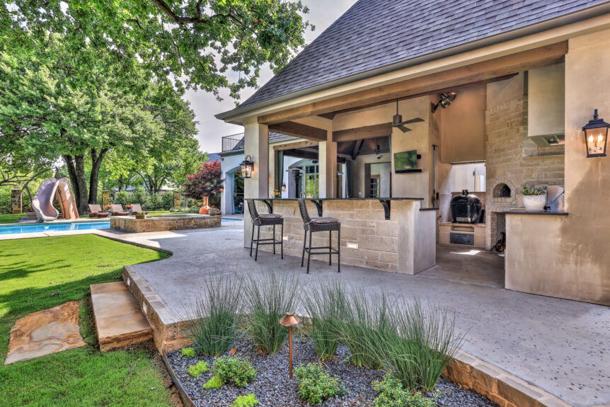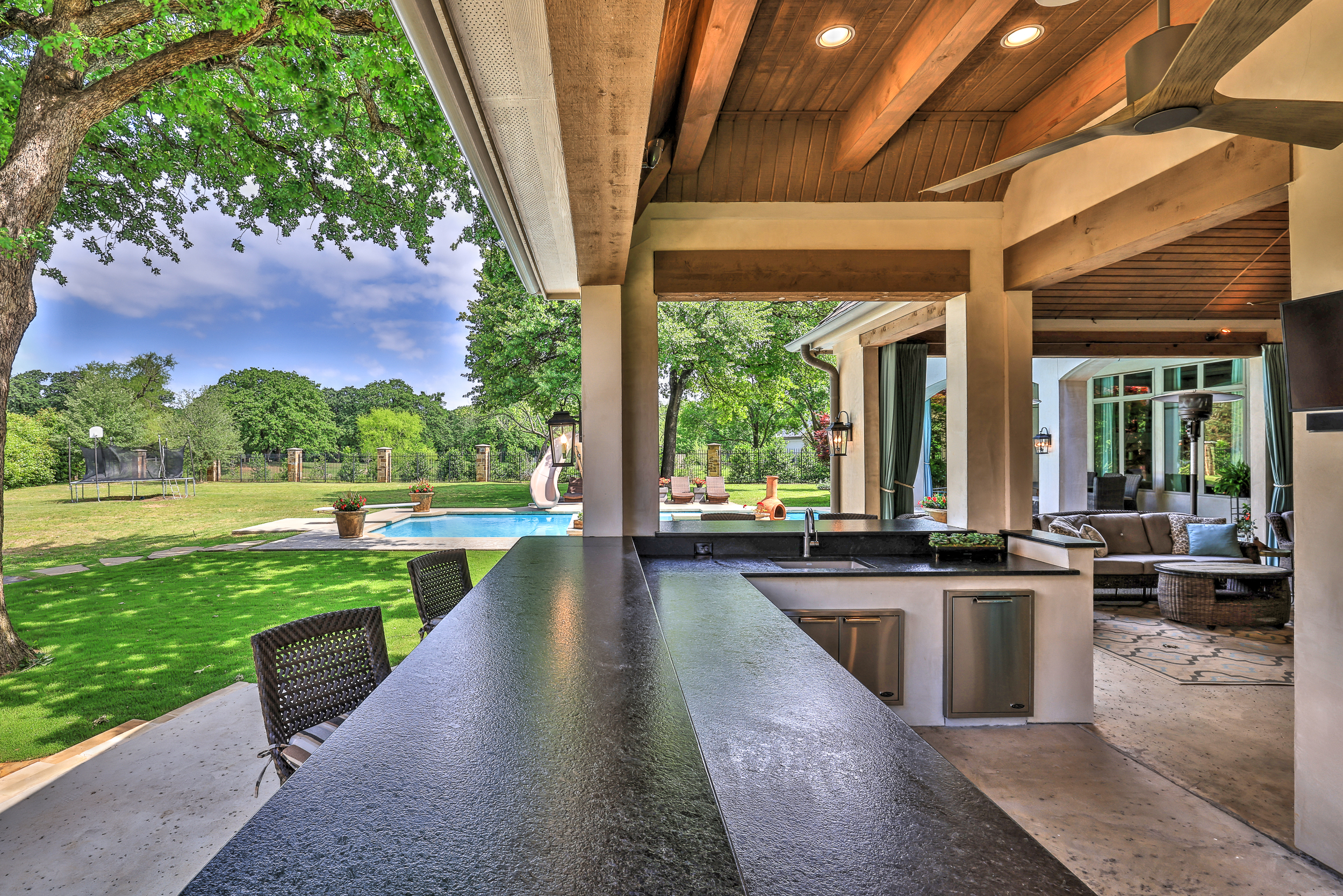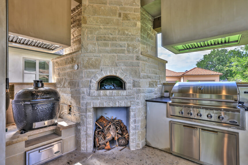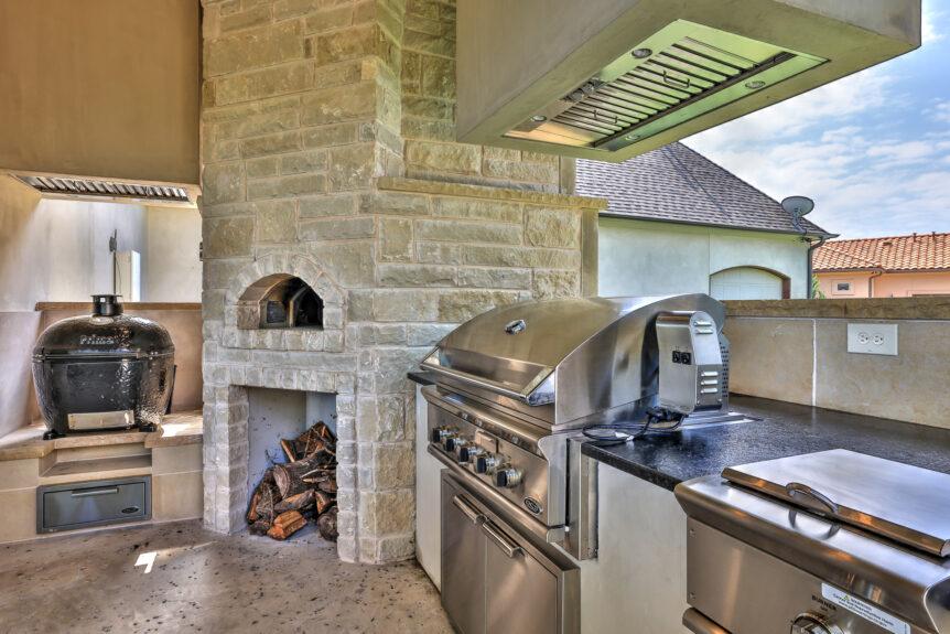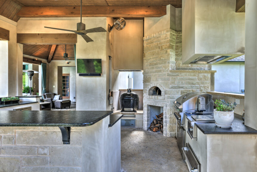 This elaborate “Gourmet” Outdoor-Kitchen was designed and built to be utilized with their existing outdoor living and swimming areas. The husband loved outdoor cooking and wanted to fully incorporate all the latest accessories which included a stone pizza oven, gas grill, smoker, refrigerator, sink, storage, and leathered granite countertops.