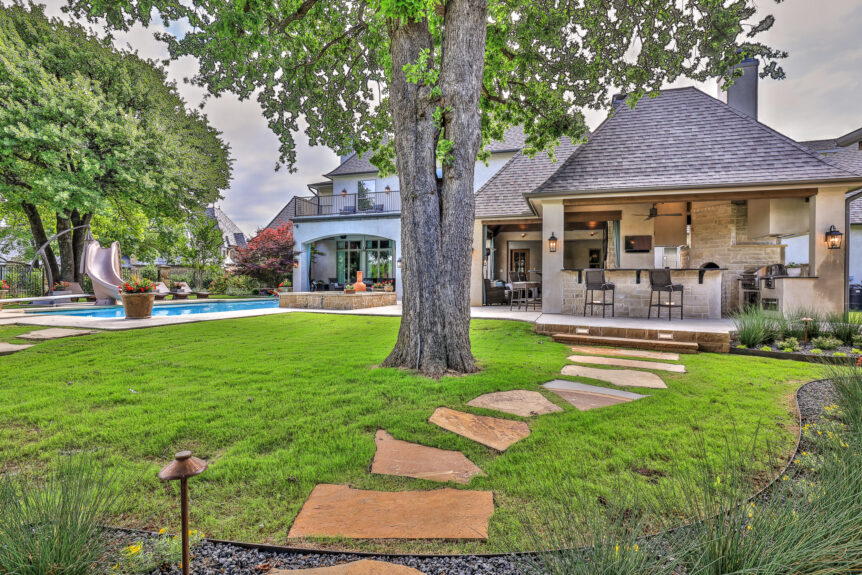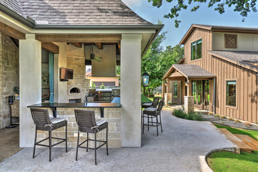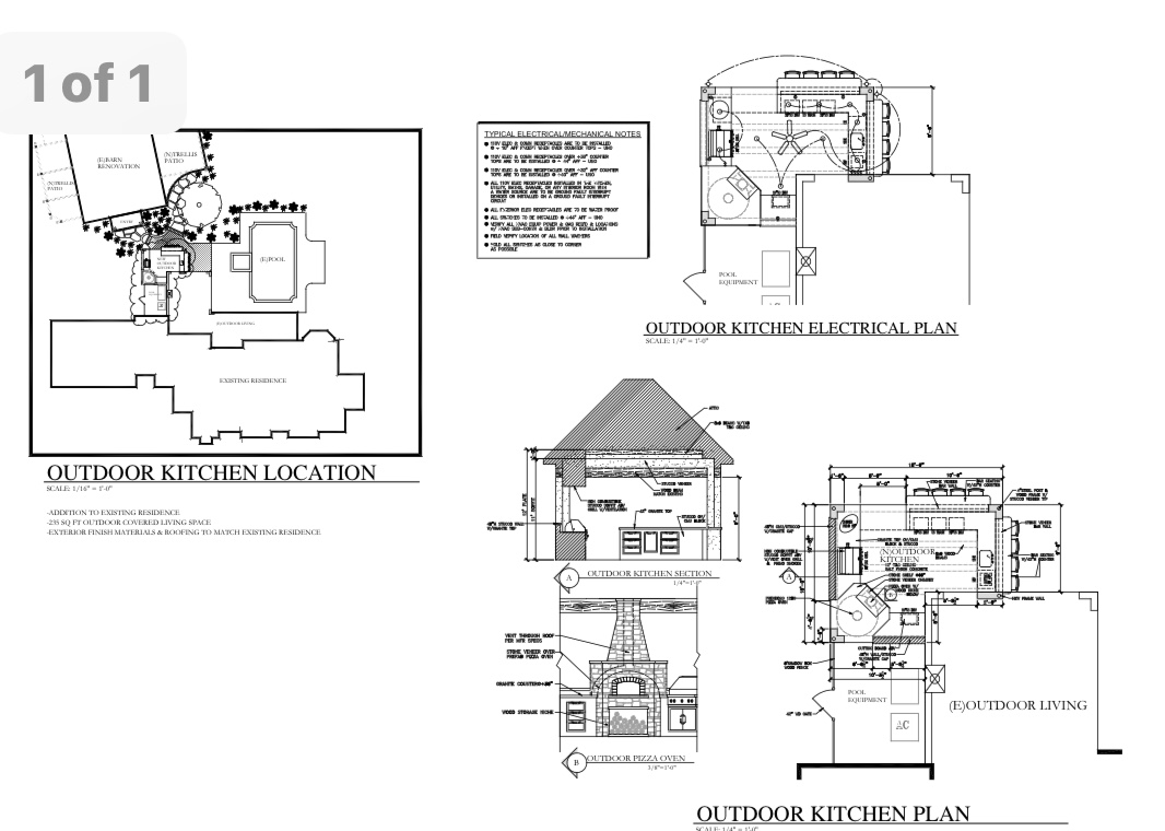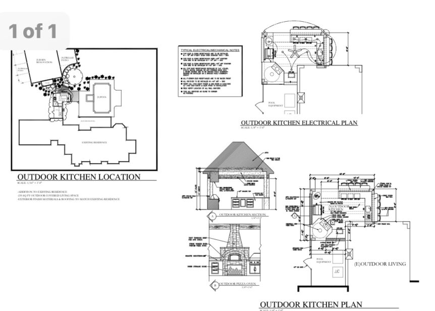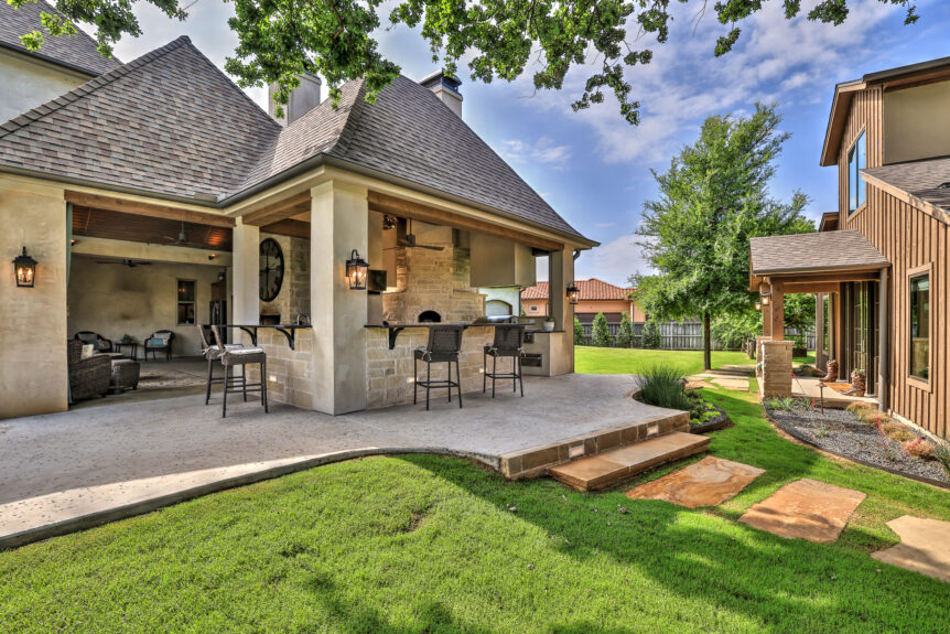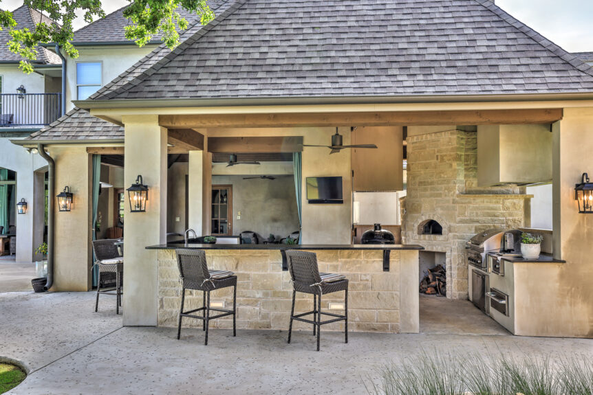 This elaborate “Gourmet” Outdoor-Kitchen was designed and built to be utilized with their existing outdoor living and swimming areas. The husband loved outdoor cooking and wanted to fully incorporate all the latest accessories which included a stone pizza oven, gas grill, smoker, refrigerator, sink, storage, and leathered granite countertops.