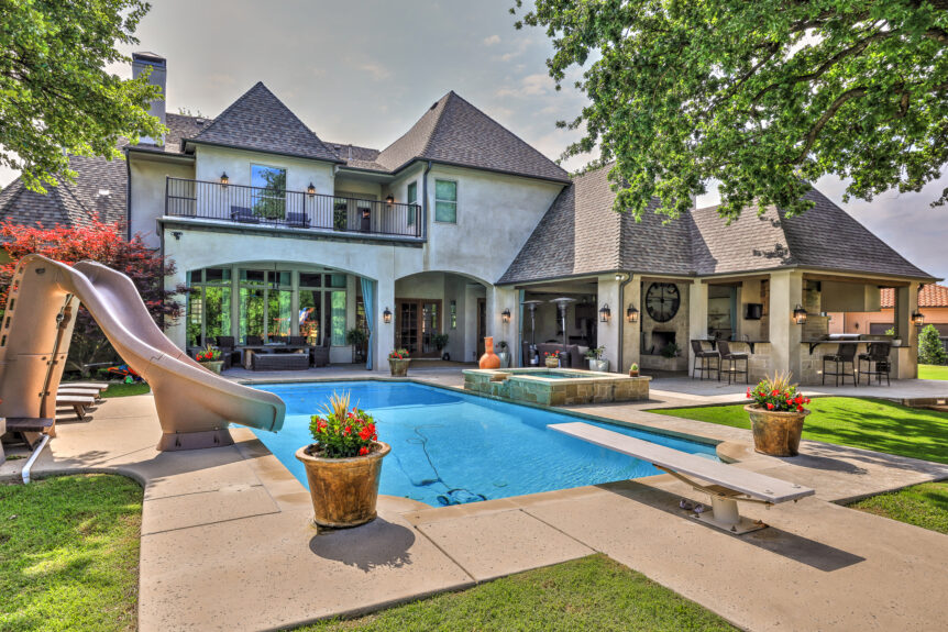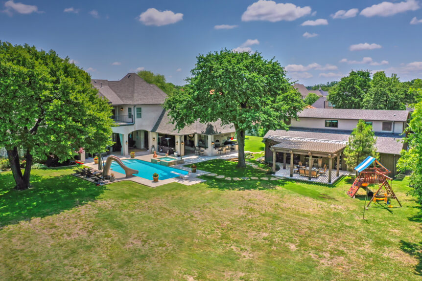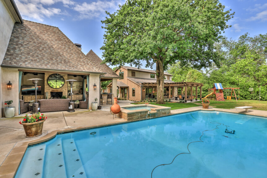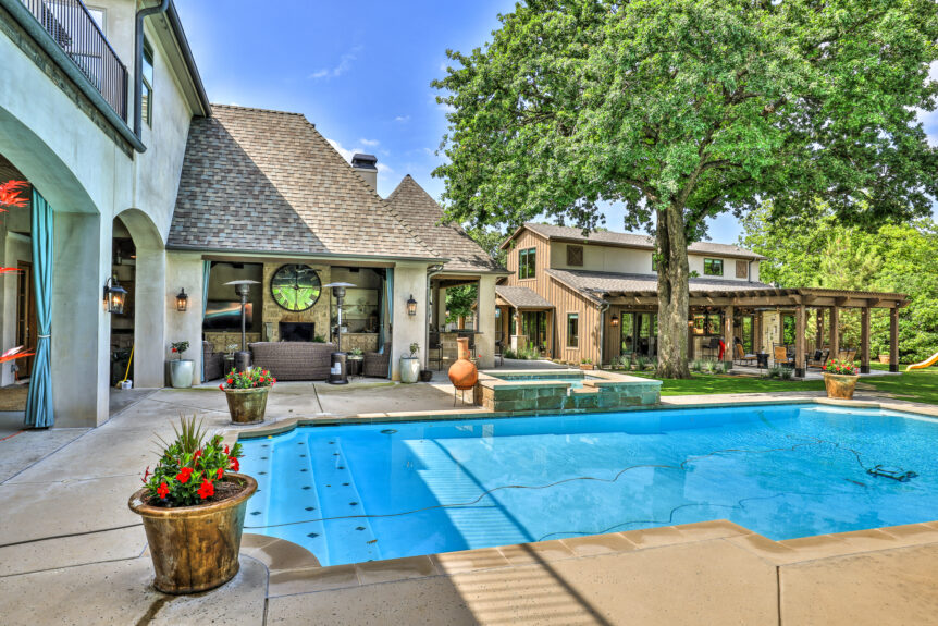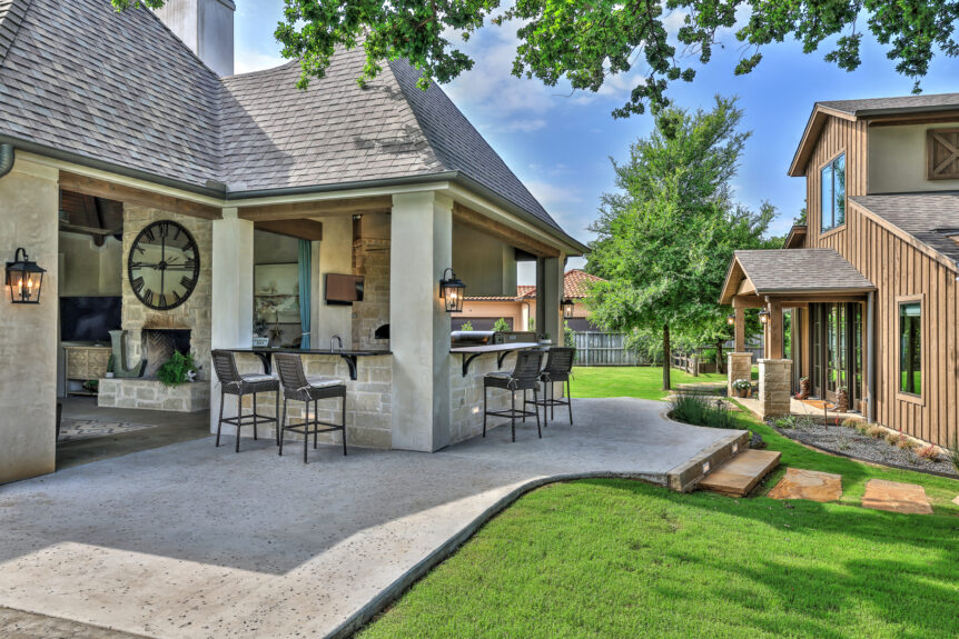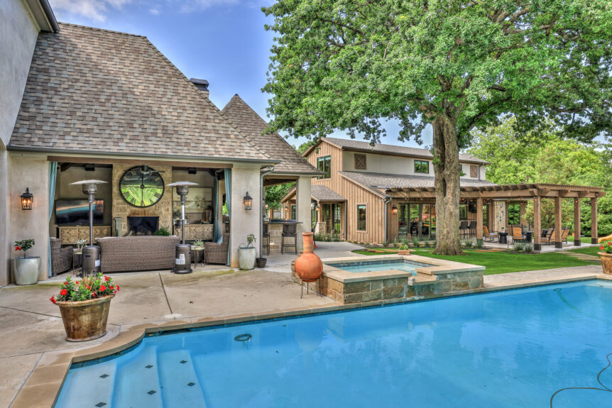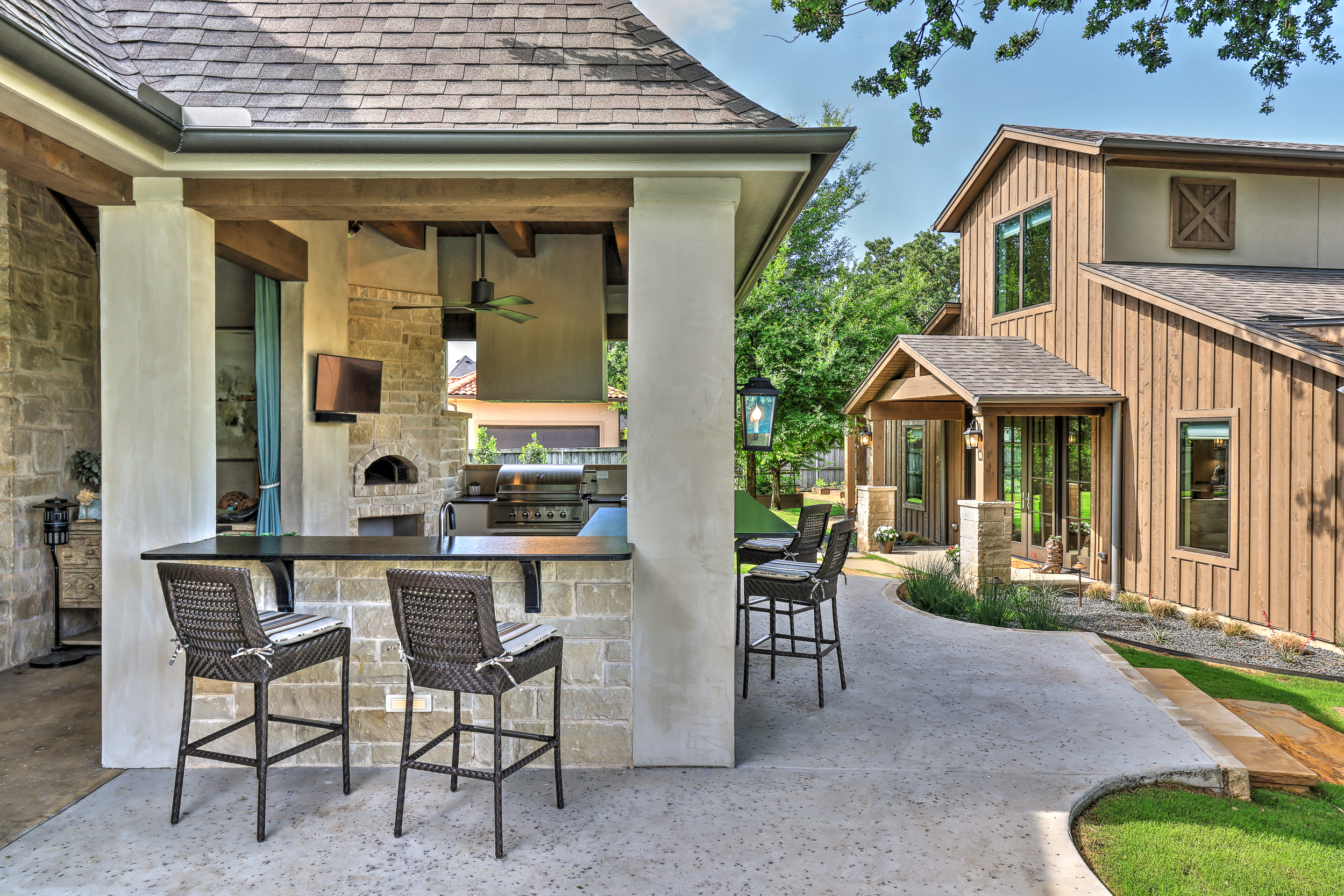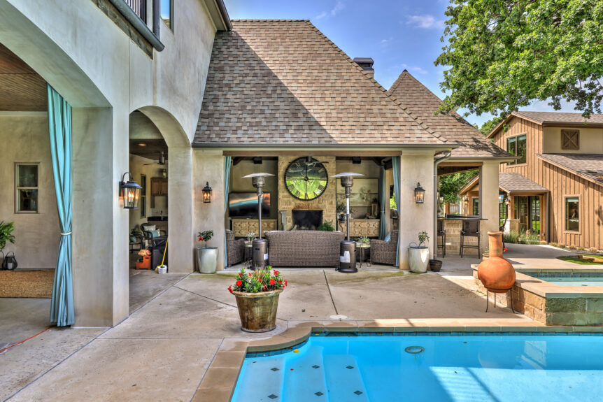The structure was architecturally designed to blend with the existing residence, which included plaster stucco finish, steep pitch hip roof with turned overhang, custom metal gutters, and 12’ ceilings with decorative ceiling beams.