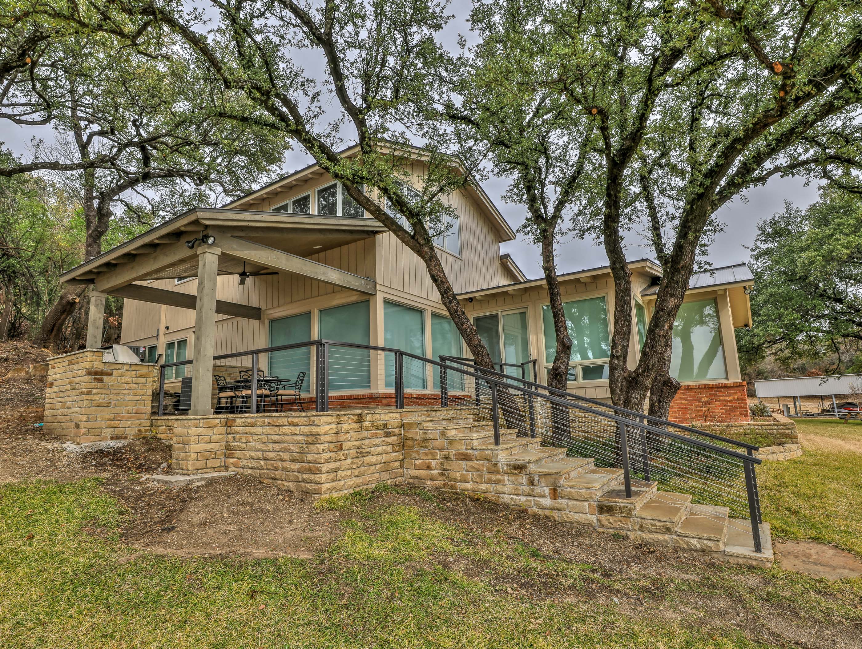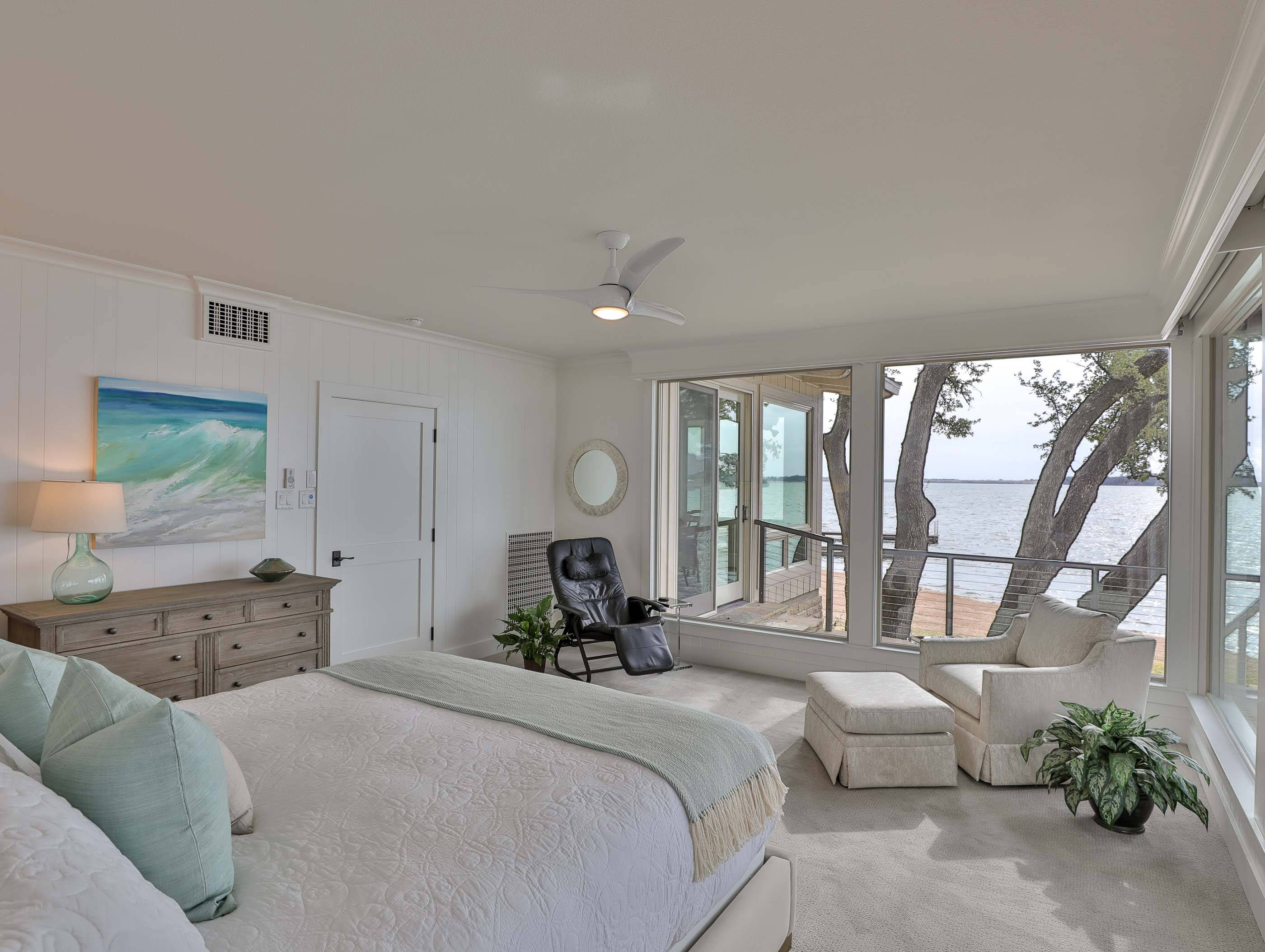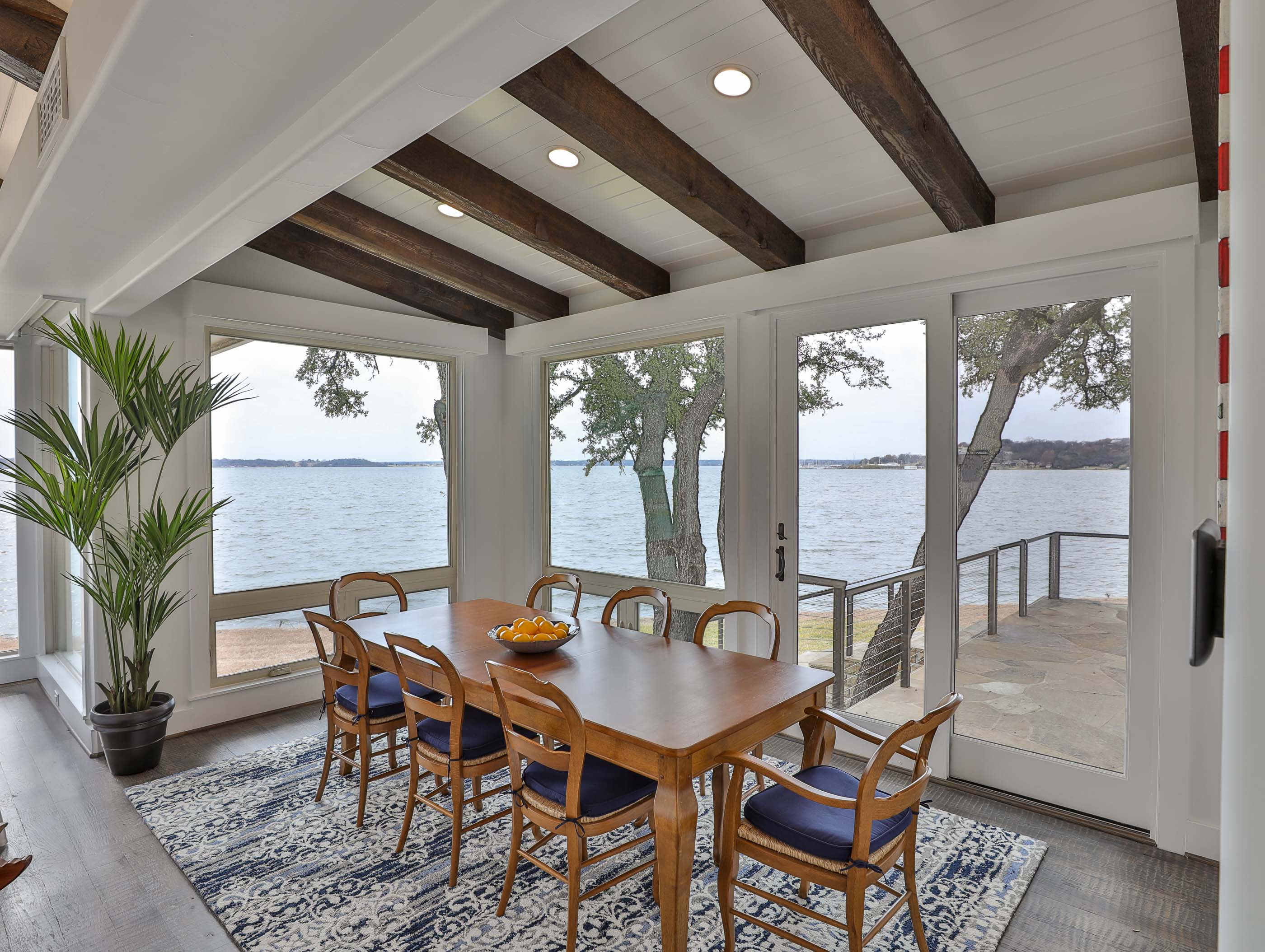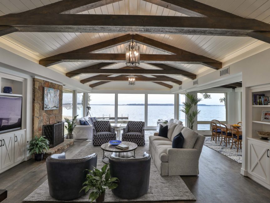 The property offered significant design potential by capitalizing on the incredible view of the lake, taking in a screened in porch for a dining area and opening the kitchen to the Living area. Valences were utilized to create an ideal opportunity for solar shading throughout the home. The charming wood beams, and painted brick were kept and blended with the new craftsman style décor. Special designed cabinets enhanced the home in the Kitchen, Living Area, all bathrooms, and Laundry Area. The existing interior painted brick and many of the beautiful wood beams were kept and refinished. Traditional hickory hardwood floors, quartz countertops, and indirect LED lighting was utilized. An outdoor living area with cooking and stainless-steel cable railings was installed.