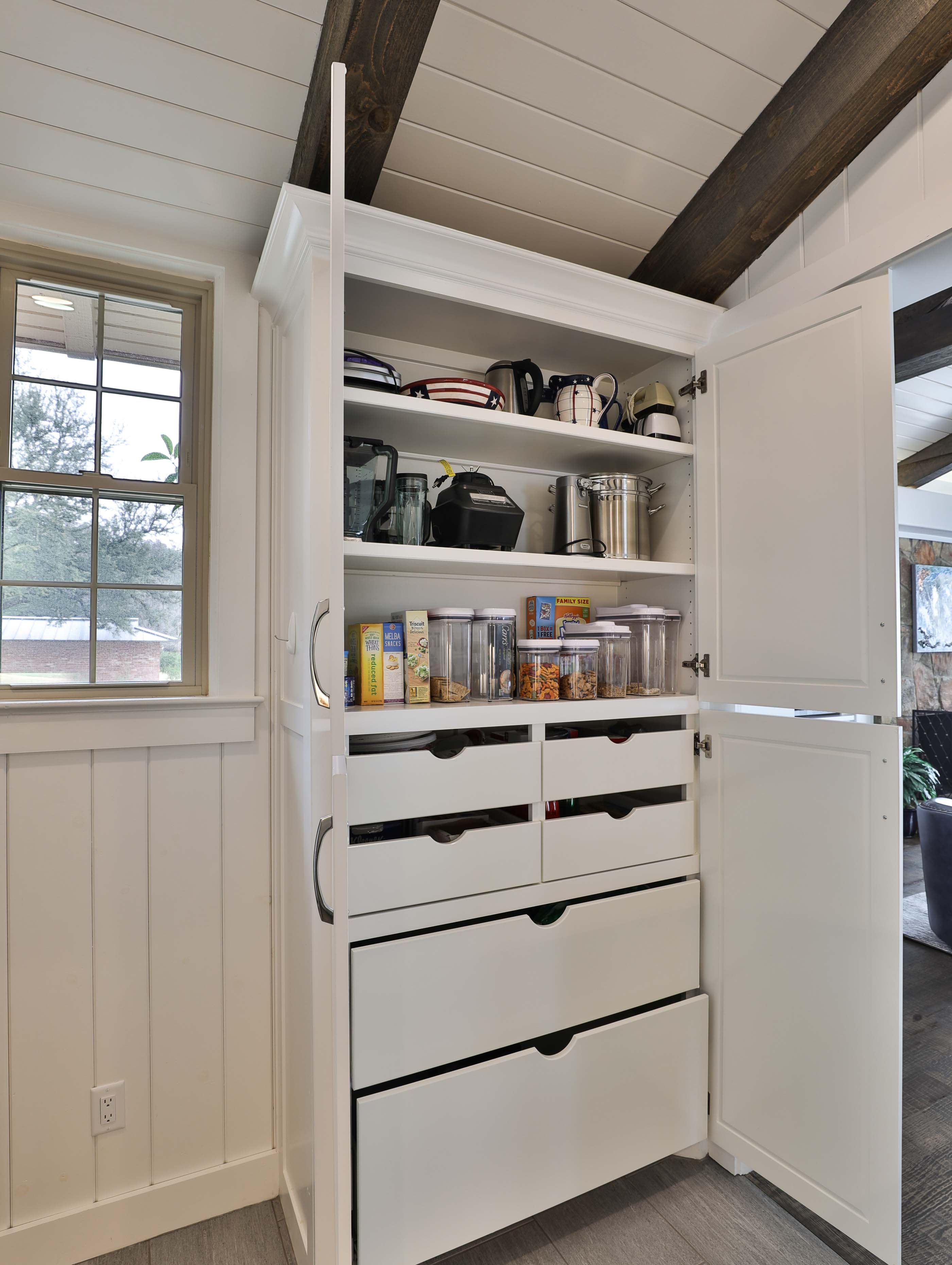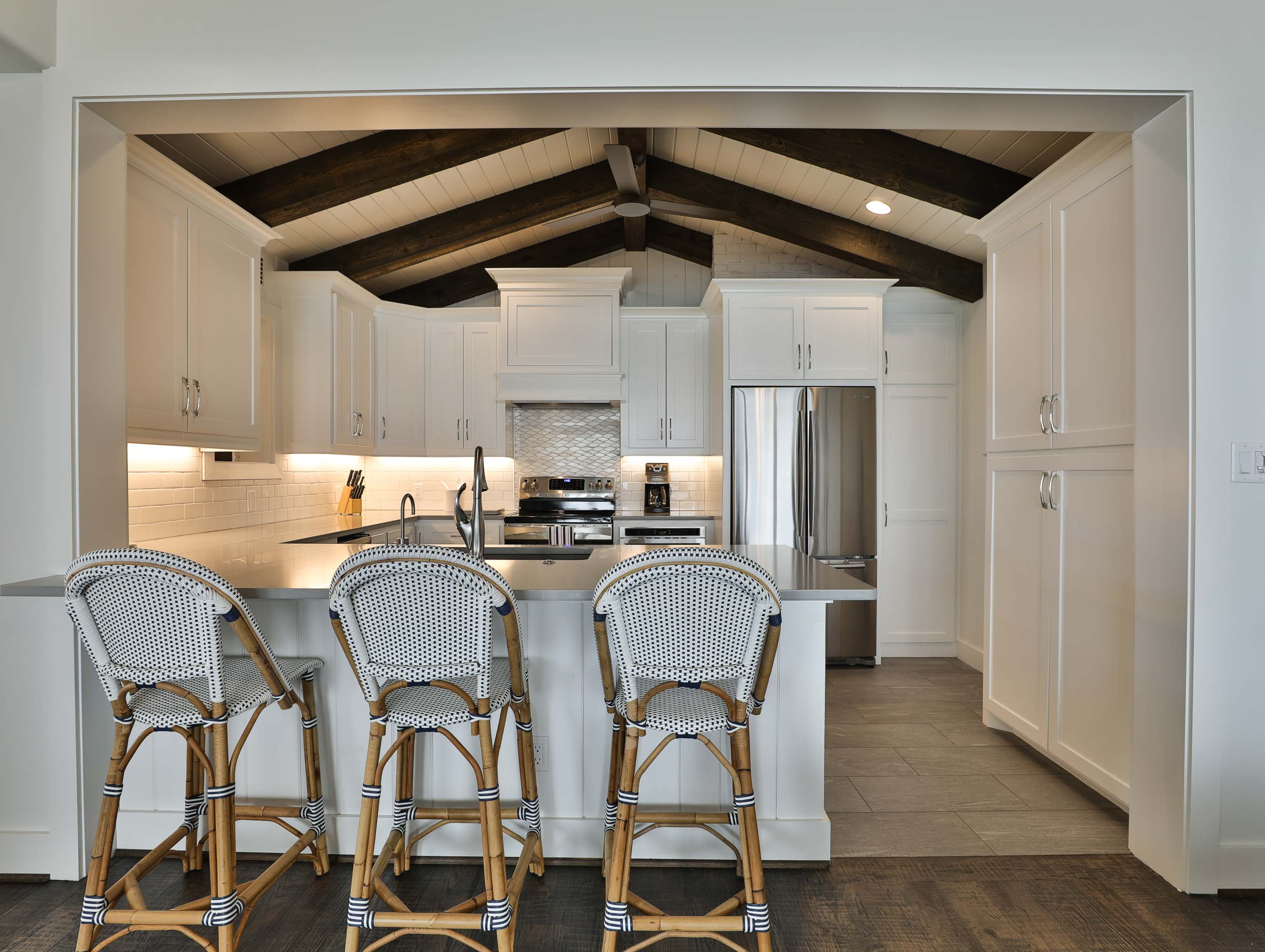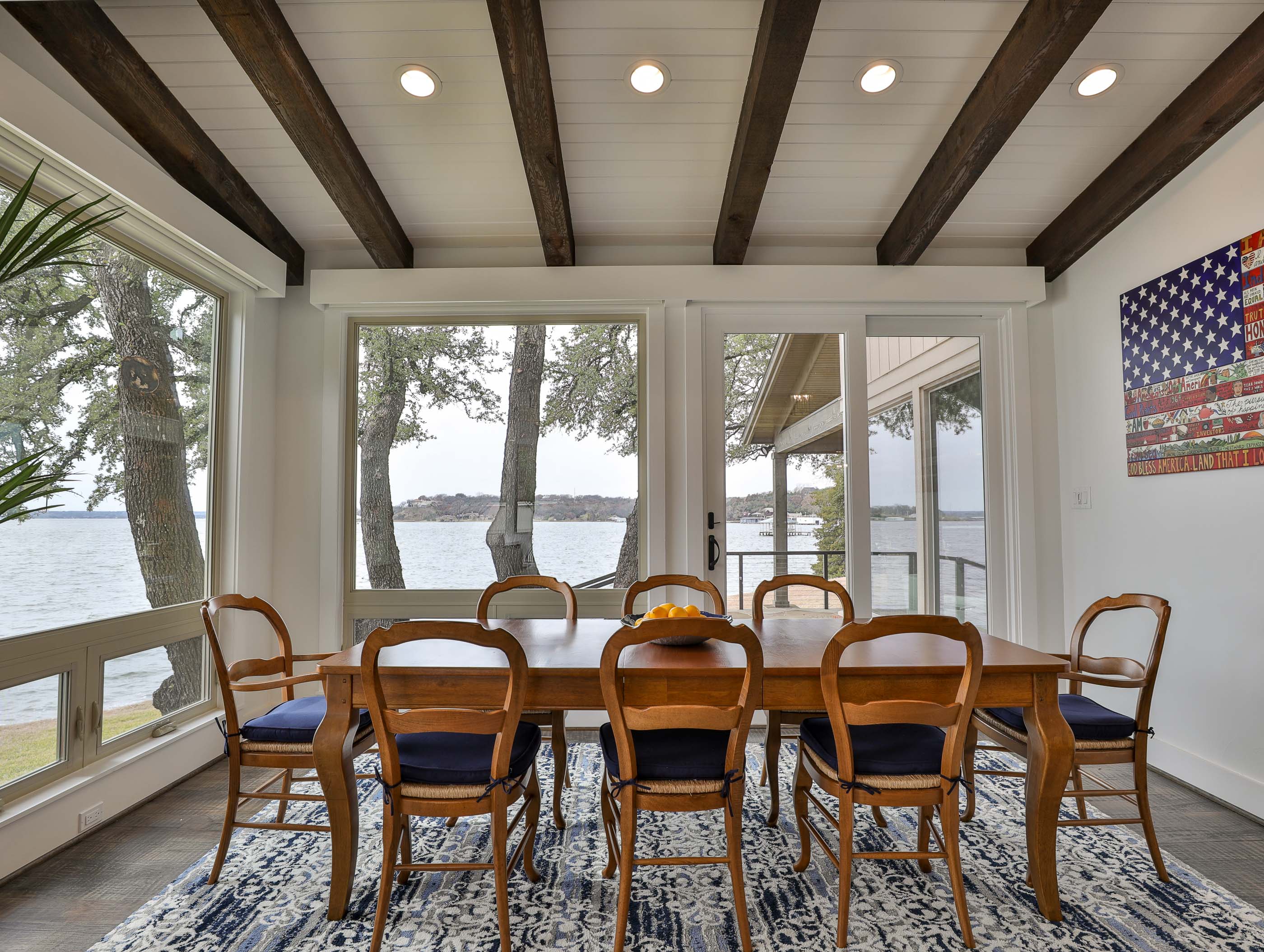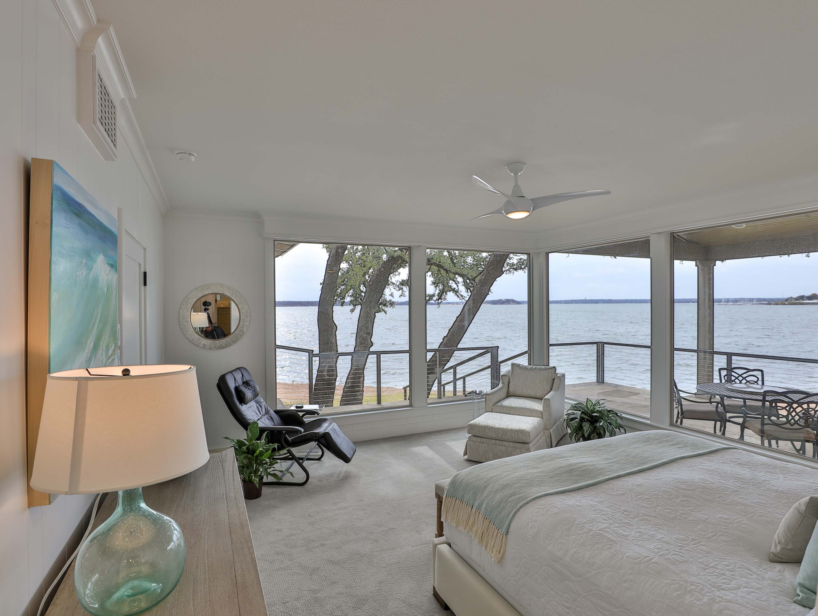 The property offered significant design potential by capitalizing on the incredible view of the lake, taking in a screened in porch for a dining area and opening the kitchen to the Living area. Valences were utilized to create an ideal opportunity for solar shading throughout the home. The charming wood beams, and painted brick were kept and blended with the new craftsman style décor. Special designed cabinets enhanced the home in the Kitchen, Living Area, all bathrooms, and Laundry Area. The existing interior painted brick and many of the beautiful wood beams were kept and refinished. Traditional hickory hardwood floors, quartz countertops, and indirect LED lighting was utilized. An outdoor living area with cooking and stainless-steel cable railings was installed.
