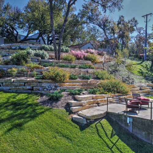 An old dilapidated stone retaining wall was torn down and redesigned with new terraced retaining walls and landscaping with stone steps leading to the rear yard. The overhead power lines were replaced with underground wiring to enhance the magnificent view. Complete landscaping and fencing work is still in process.