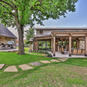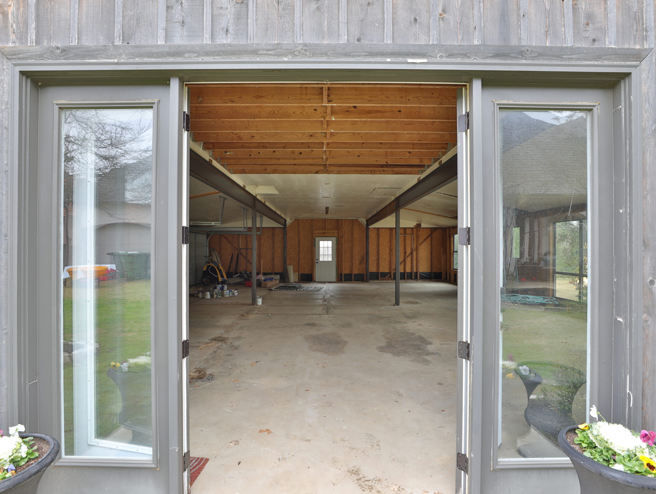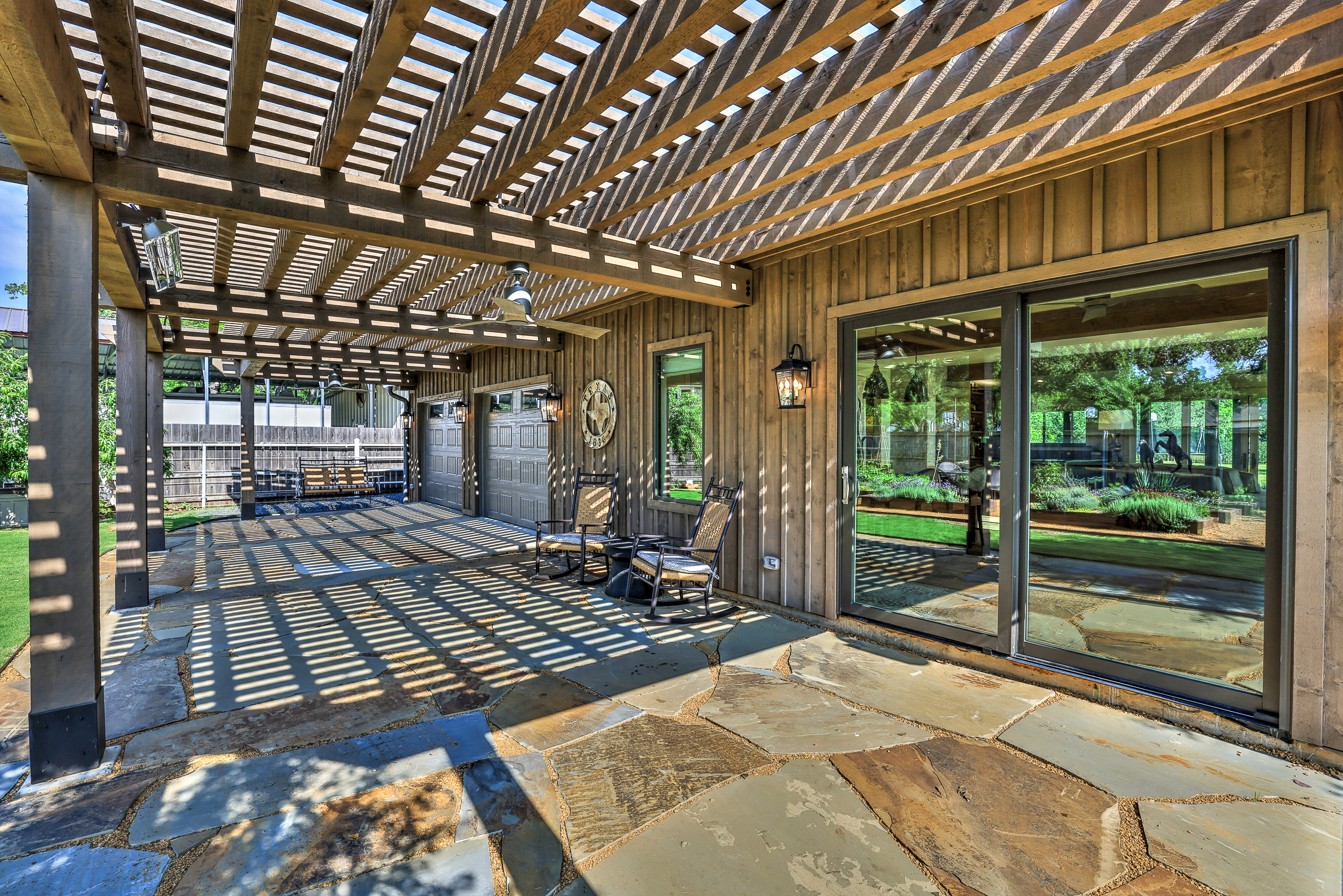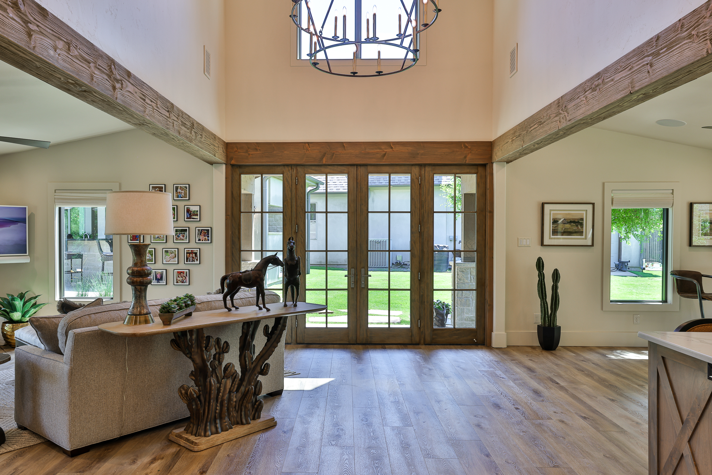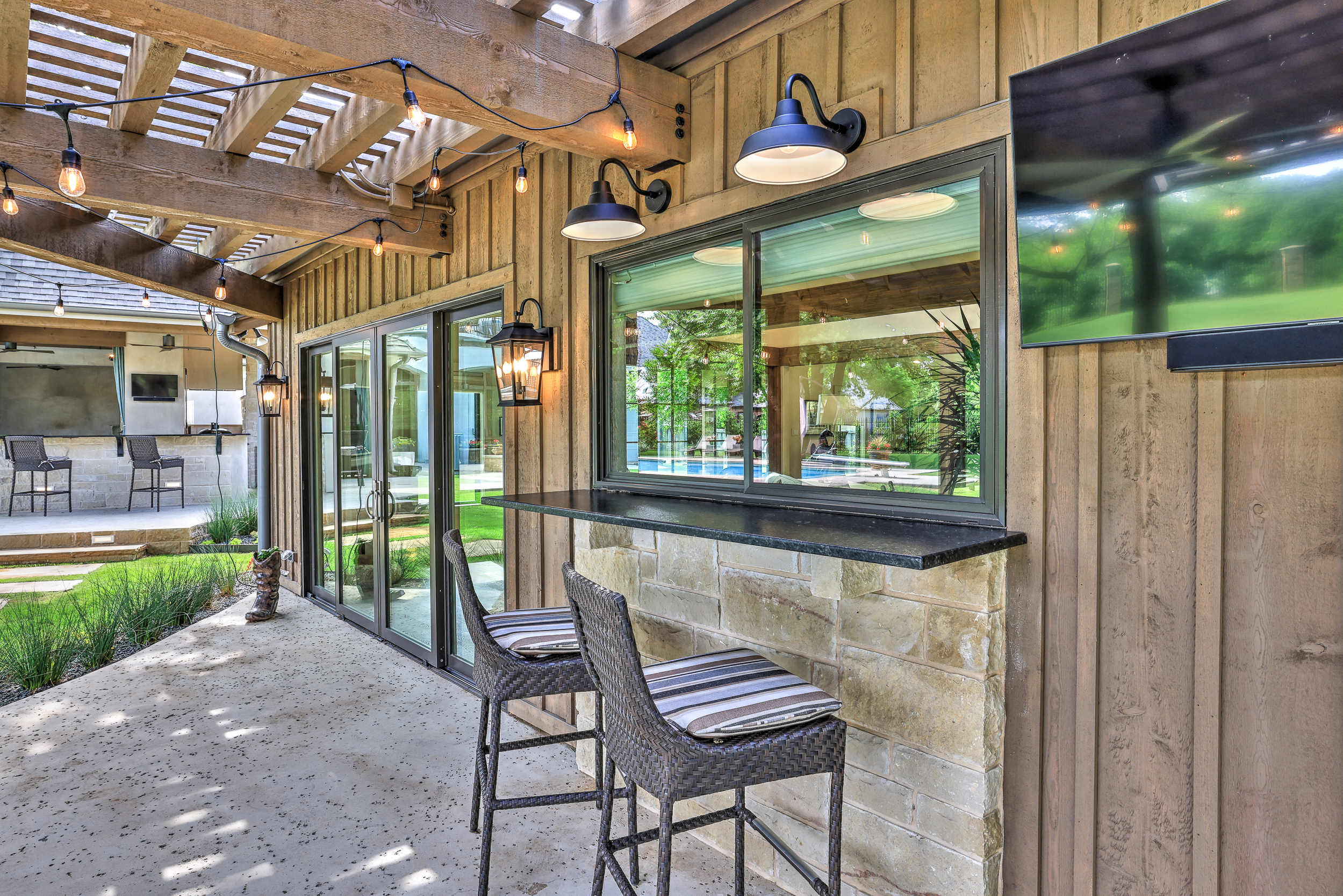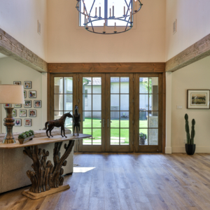 This beautiful courtyard renovation was made possible by the desires for change by these clients. They had built the house originally in the 70’s from a plan they used in California on a previous home they had built. The clients stated they loved their home but were never able to utilize the courtyard for many parts of the year due to the extreme Texas climate. AIBD Building Designer Ron Parker redesigned the space utilizing a series of Velux glass skylights and open stucco archways. Through significant structural engineering and beam placement, this phenomenal open concept courtyard was created that not only blends with the existing home, but enhances it as well. Ron and his wife, Lila were watching a movie when he noticed for a brief second a beautiful contemporary entry door from an historic building in the film. Ron utilized this inspiration for the design of the gorgeous contemporary iron and glass doors and arched transom, which became the focal point for this contemporary home. This project also included replacing the windows on the front of the residence and replacing the wood bands with new stucco bands that blended with the home. The stucco was re-plastered for all the modifications, the tile roof was replaced, and new AC systems were installed to compensate for the additional space. The sidewalk was replaced with pattern concrete “stone faced” stained concrete and the yard was completely re-landscaped.