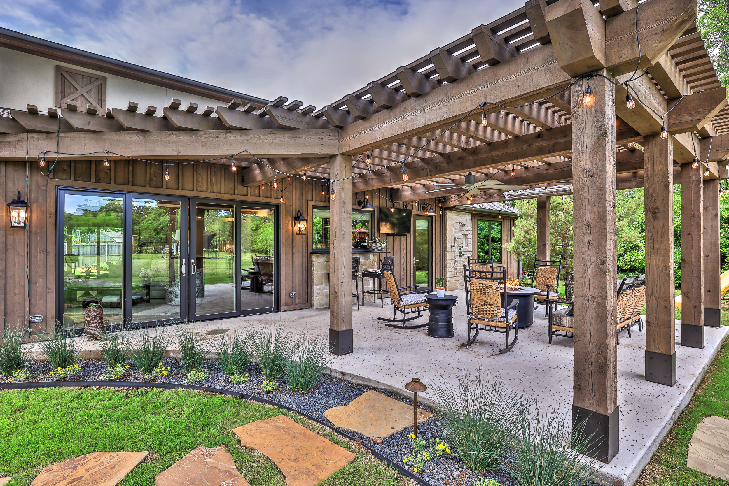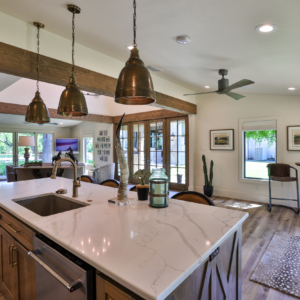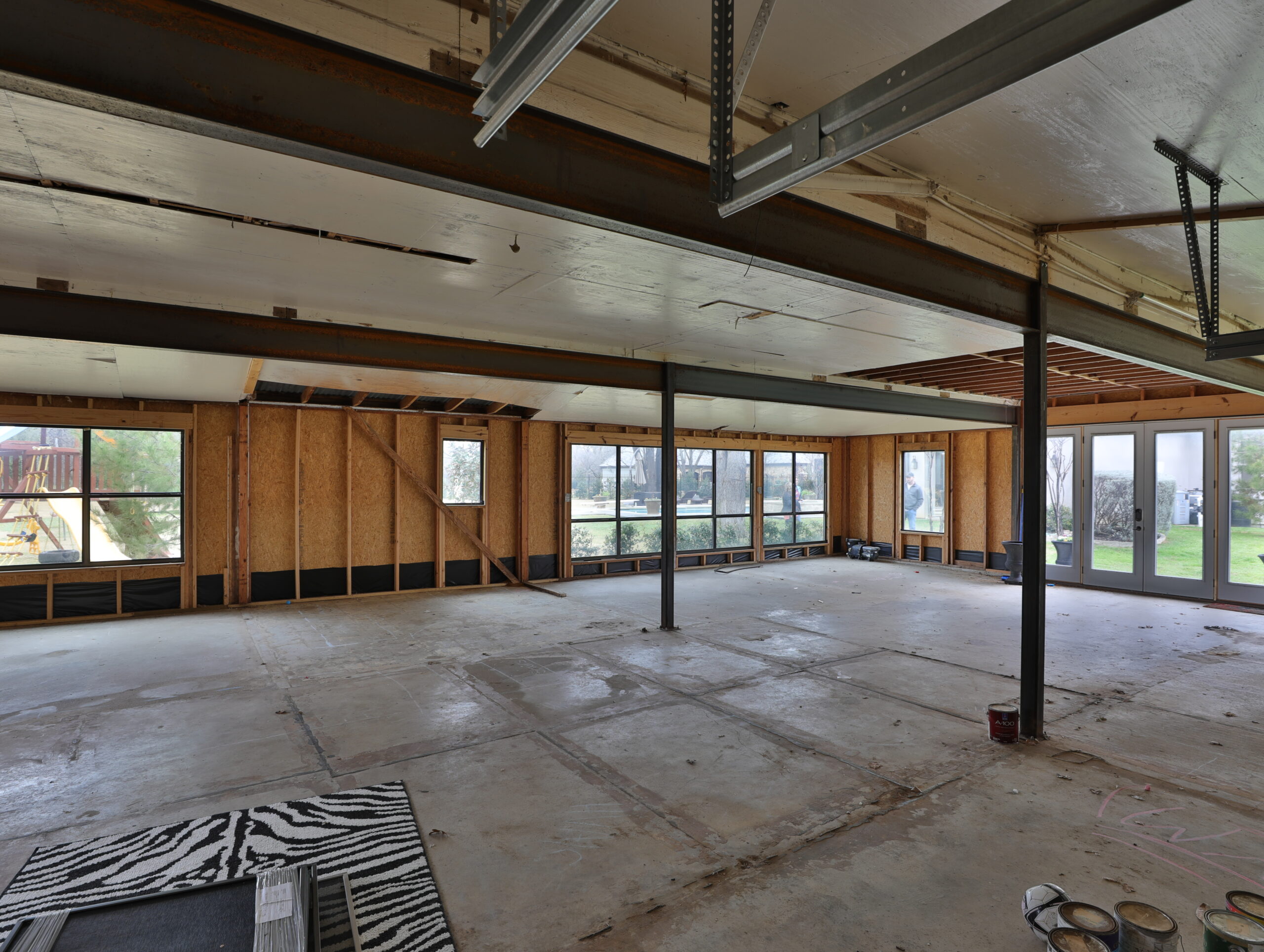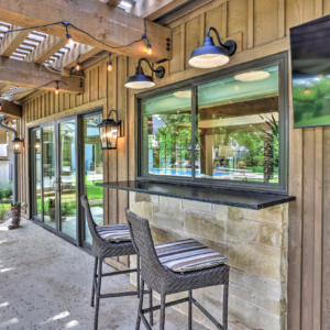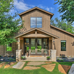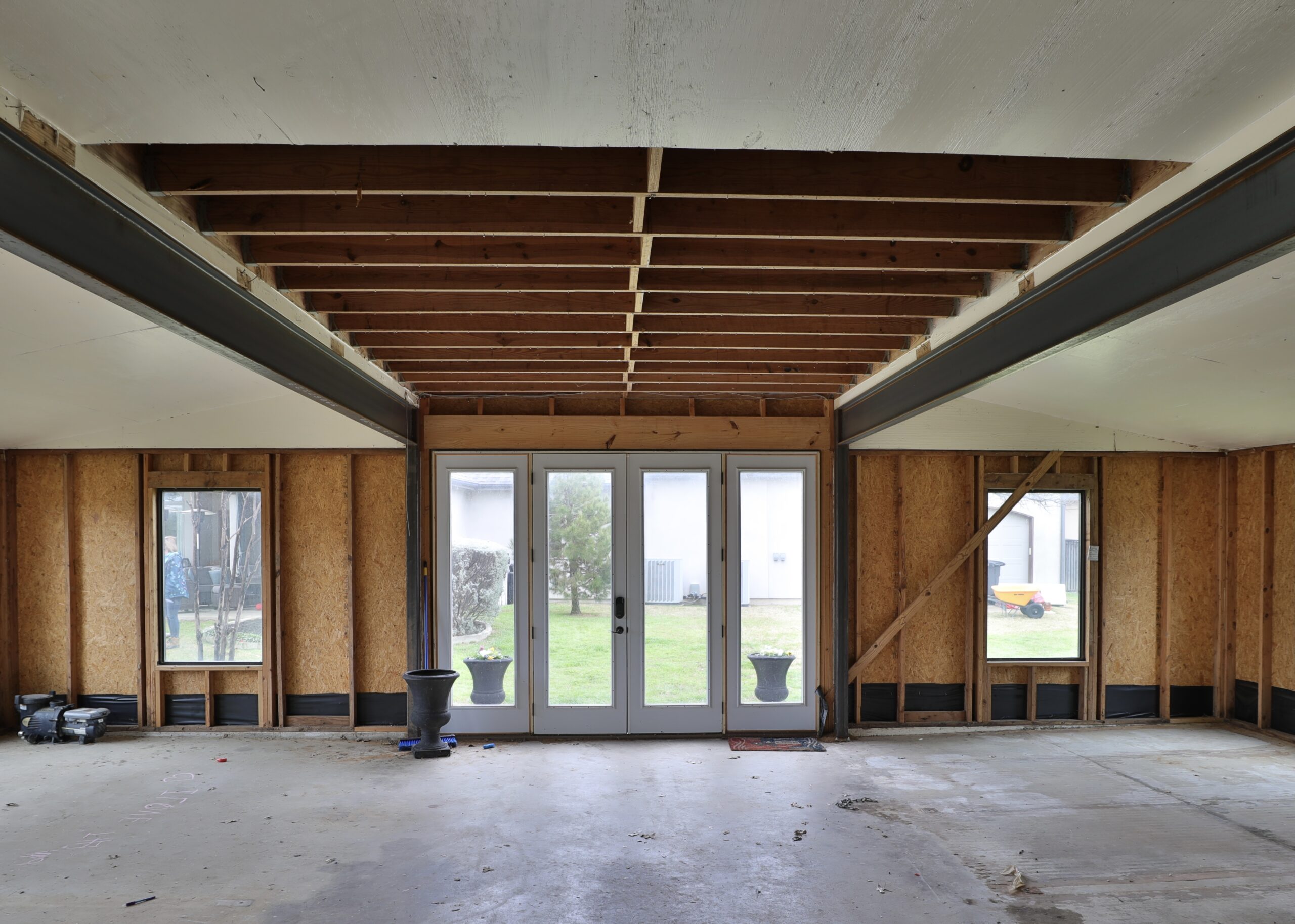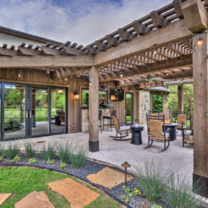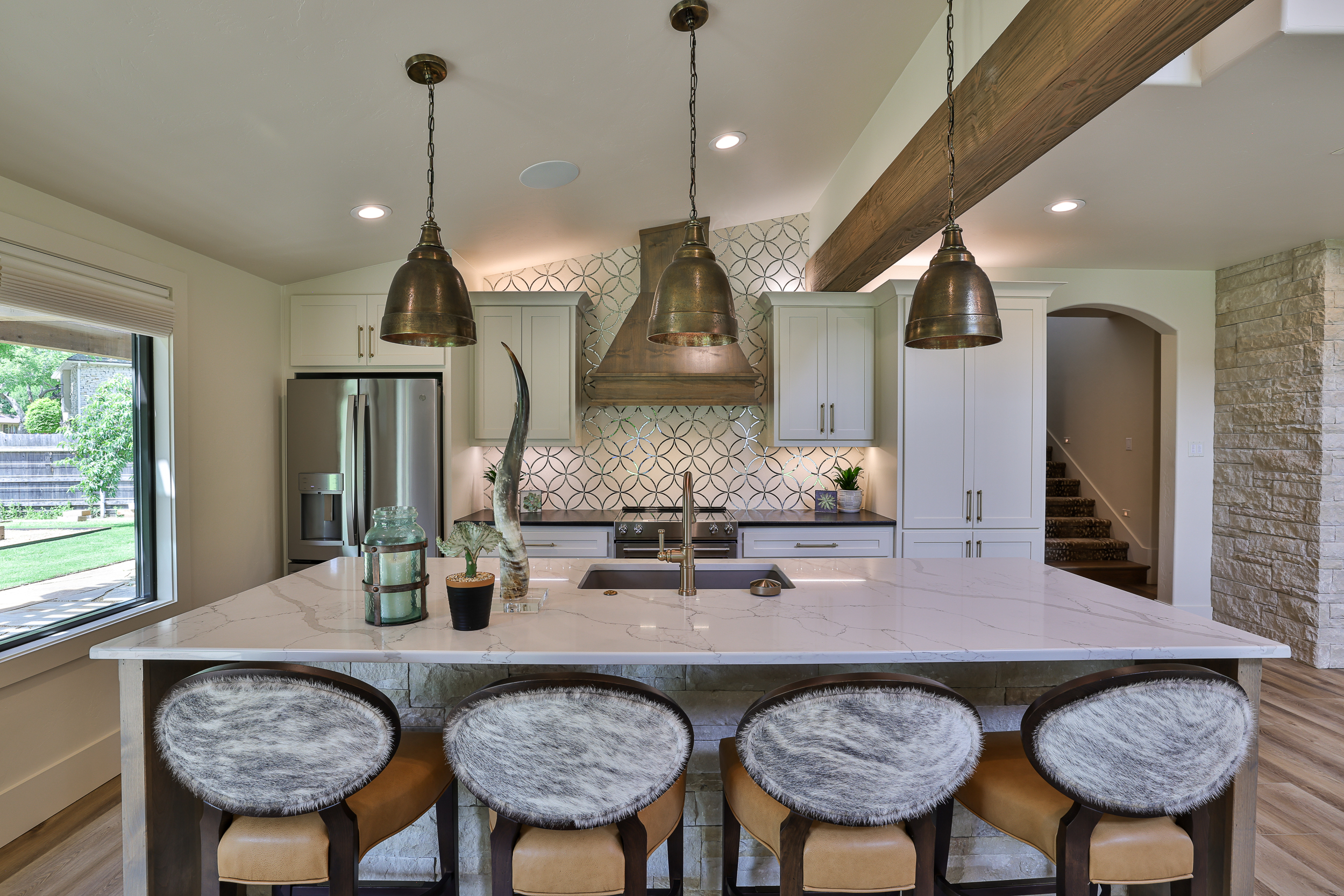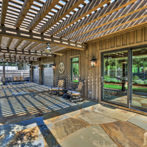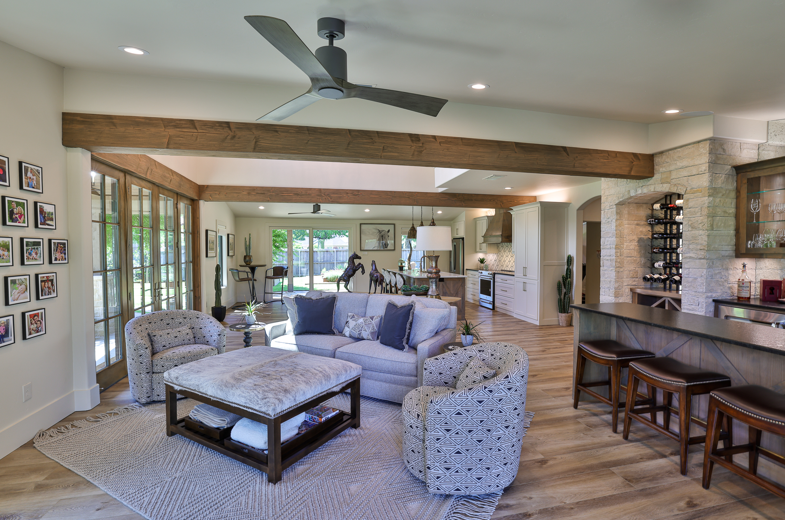 This beautiful courtyard renovation was made possible by the desires for change by these clients. They had built the house originally in the 70’s from a plan they used in California on a previous home they had built. The clients stated they loved their home but were never able to utilize the courtyard for many parts of the year due to the extreme Texas climate. AIBD Building Designer Ron Parker redesigned the space utilizing a series of Velux glass skylights and open stucco archways. Through significant structural engineering and beam placement, this phenomenal open concept courtyard was created that not only blends with the existing home, but enhances it as well. Ron and his wife, Lila were watching a movie when he noticed for a brief second a beautiful contemporary entry door from an historic building in the film. Ron utilized this inspiration for the design of the gorgeous contemporary iron and glass doors and arched transom, which became the focal point for this contemporary home. This project also included replacing the windows on the front of the residence and replacing the wood bands with new stucco bands that blended with the home. The stucco was re-plastered for all the modifications, the tile roof was replaced, and new AC systems were installed to compensate for the additional space. The sidewalk was replaced with pattern concrete “stone faced” stained concrete and the yard was completely re-landscaped.