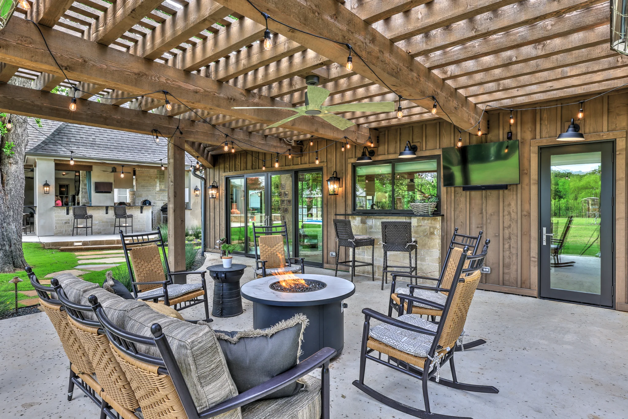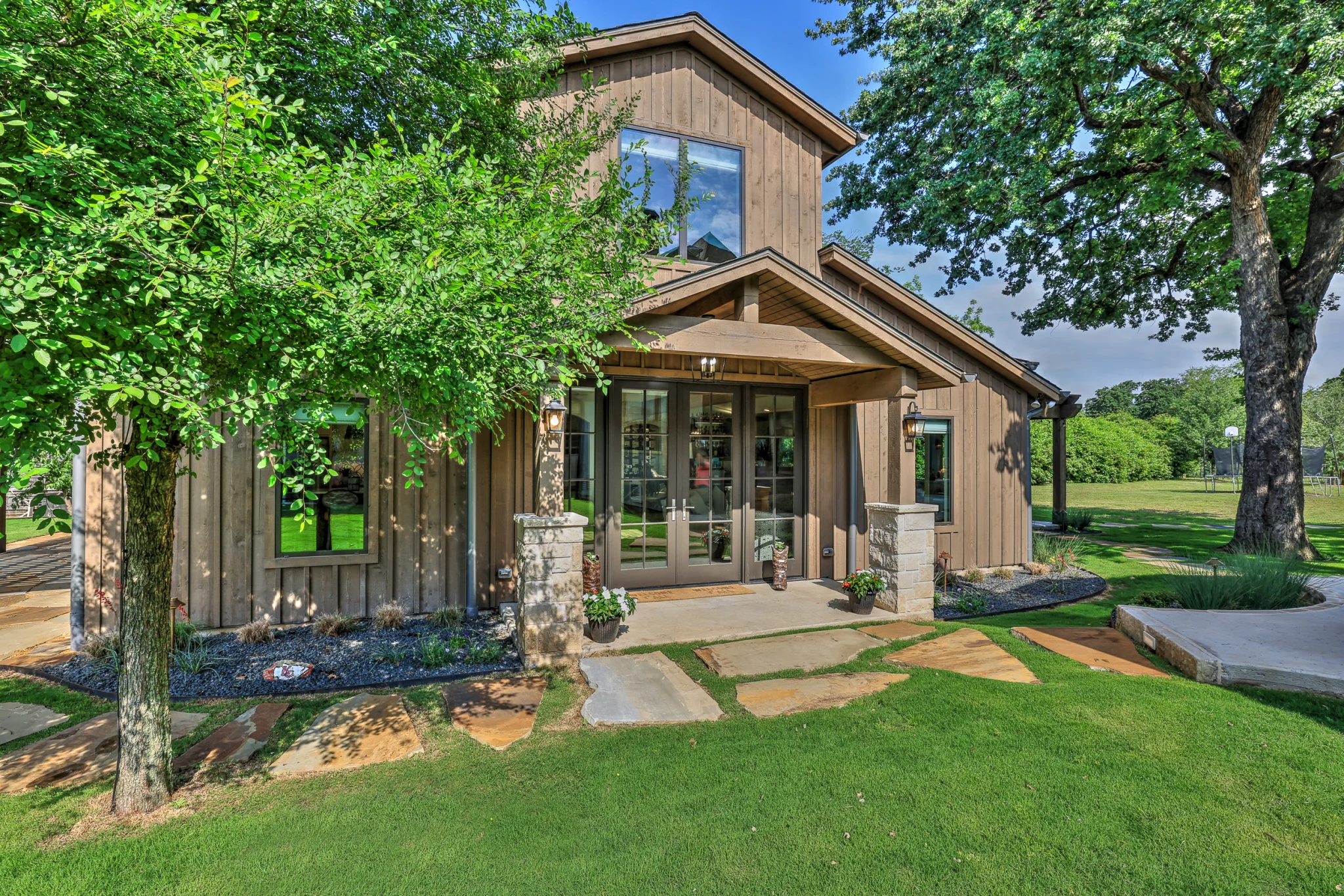 The owners of this beautiful home and property utilized the talents of the Fred Parker Company "Design-Build" team to renovate this barn into a guest house..The property was once a beautiful Texas farm with a working barn that was kept when the property was developed into large estate properties. The owner’s dream was to restore and renovate the old barn into a Luxury but rustic guest house and cabana for parties and to accommodate their out of town family. The structure was evaluated for structural integrity and required obtaining re-zoning for a secondary dwelling with the city of Mansfield which was very accommodating. The barn was recreated with a two story Entry with vaulted ceilings and ceiling beams, an elaborate Kitchen Living Area, Snack Bar, Exercise Room, two Guest Bedrooms, Pool Bath and Guest Bath, storage room, and two beautiful heavy timber trellis patios.