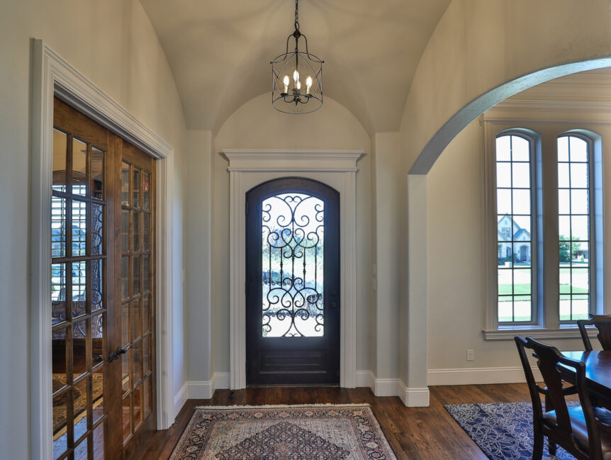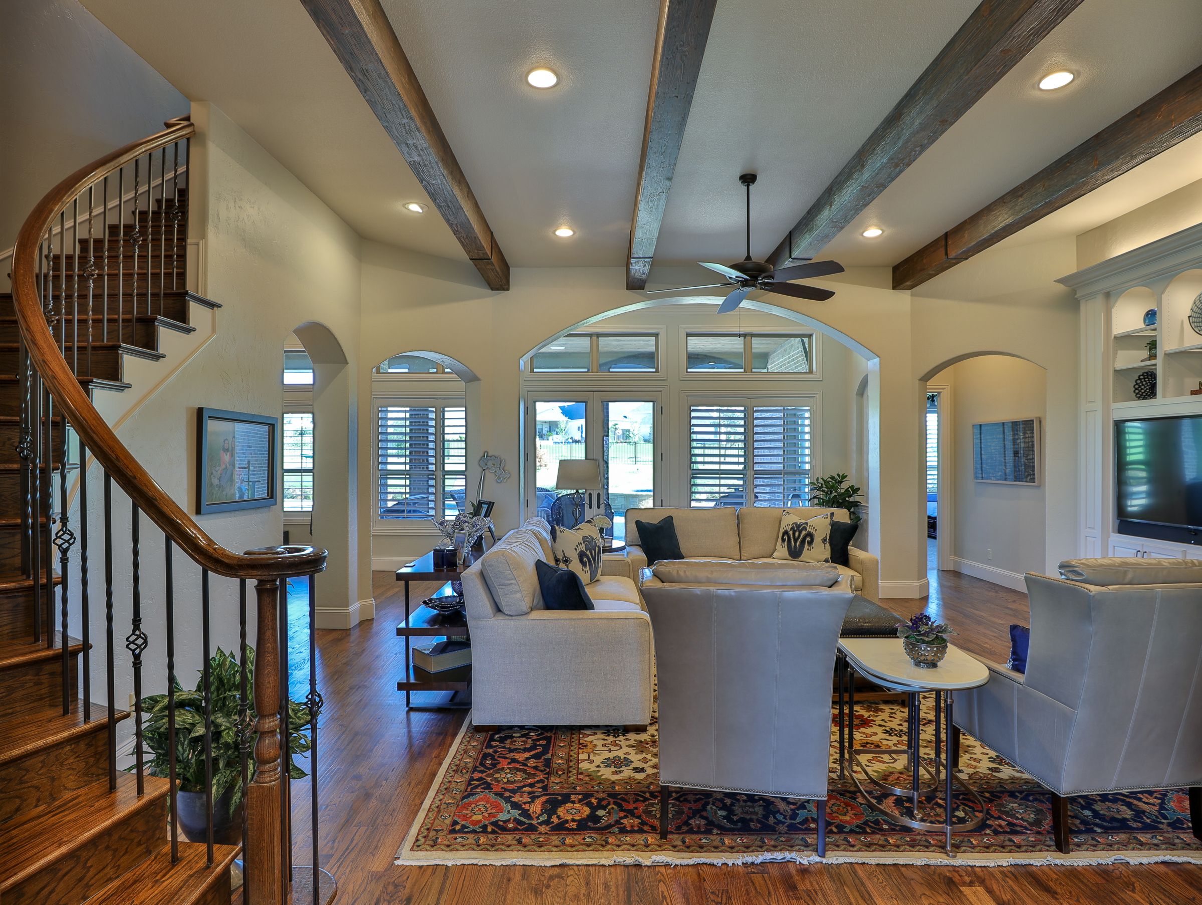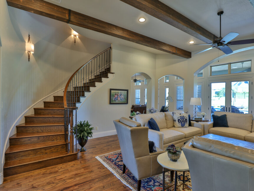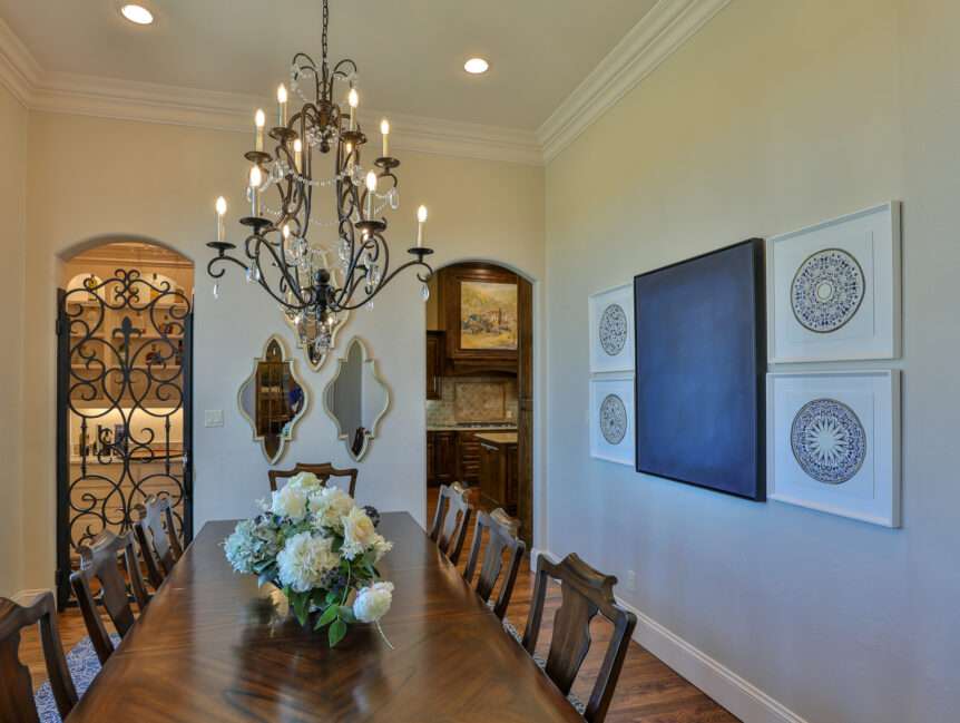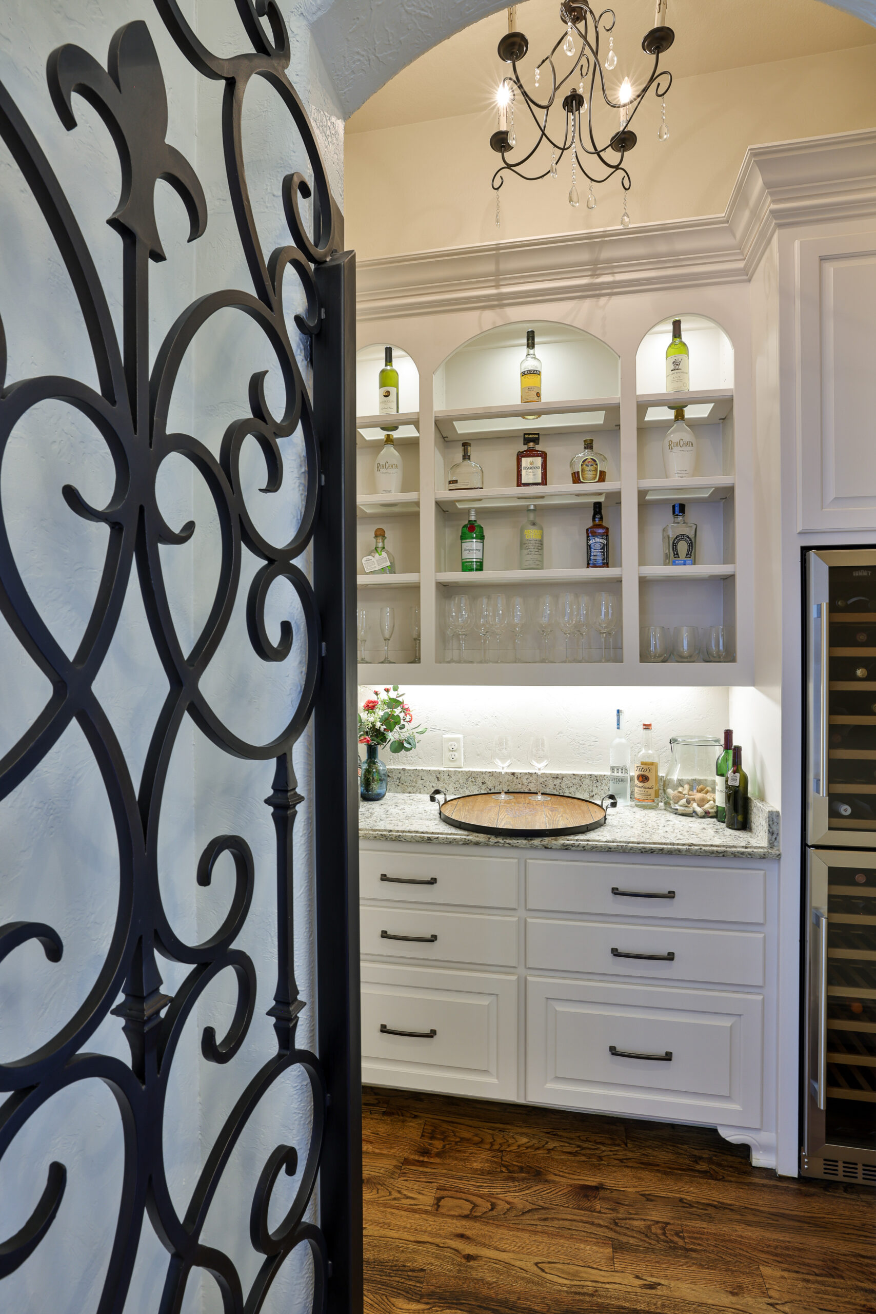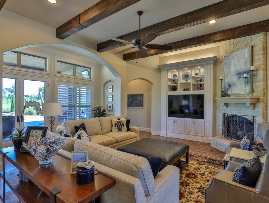The clients of this transitional style home worked with Ron Parker AIBD and the design build team of the Fred Parker Company to make significant improvements to their home to accommodate the needs of their blended family. The home was completely renovated throughout the foyer, grand room, kitchen, family area, dining room, and study. The two-story grand room was redesigned reducing the ceiling height from 22’ to 12’ to allow space for new upstairs rooms to be added. The room was re-defined with drywall arches creating a beautiful Loggia to the pool. The room was accented with stained wood beams, new entertainment center, and updated fireplace. The Dining Room features an elaborate window pediment and a new wine room with elaborate iron gate. The Foyer was transformed with a groin vault ceiling and the Study was updated with stained built in cabinets, wainscot paneling and decorative stained beams.