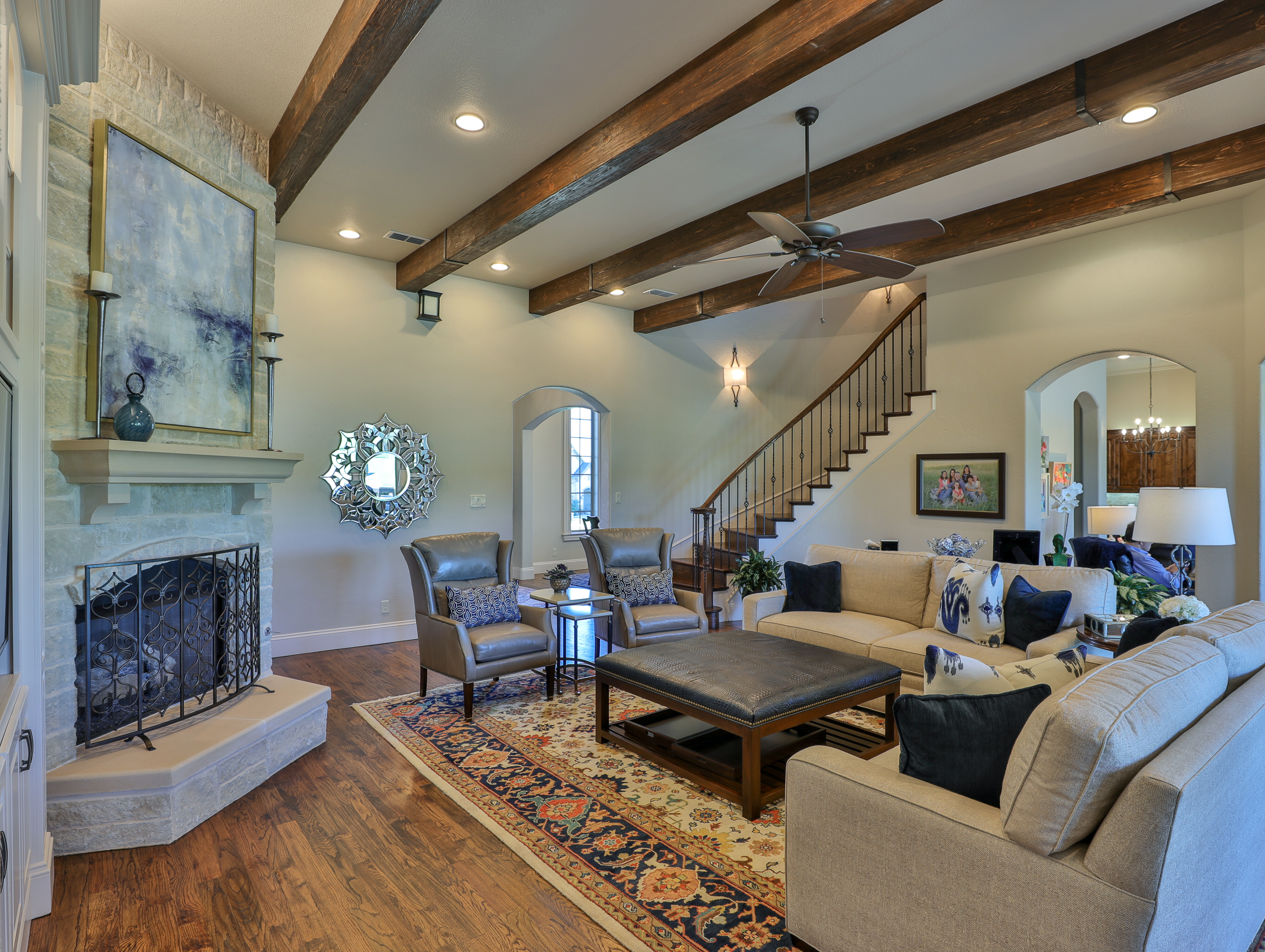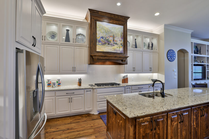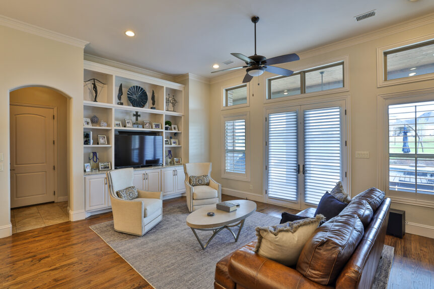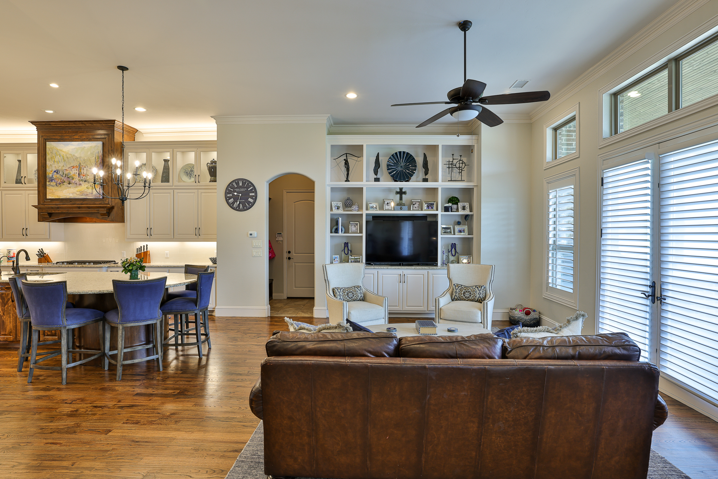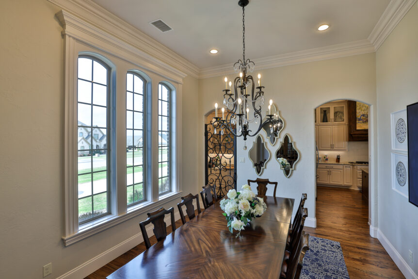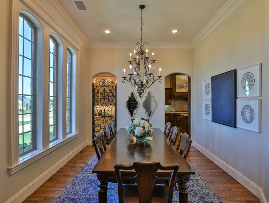 The clients of this transitional style home worked with Ron Parker AIBD and the design build team of the Fred Parker Company to make significant improvements to their home to accommodate the needs of their blended family. The home was completely renovated throughout the foyer, grand room, kitchen, family area, dining room, and study. The two-story grand room was redesigned reducing the ceiling height from 22’ to 12’ to allow space for new upstairs rooms to be added. The room was re-defined with drywall arches creating a beautiful Loggia to the pool. The room was accented with stained wood beams, new entertainment center, and updated fireplace. The Dining Room features an elaborate window pediment and a new wine room with elaborate iron gate. The Foyer was transformed with a groin vault ceiling and the Study was updated with stained built in cabinets, wainscot paneling and decorative stained beams.