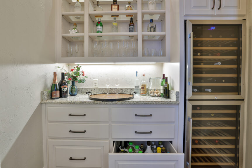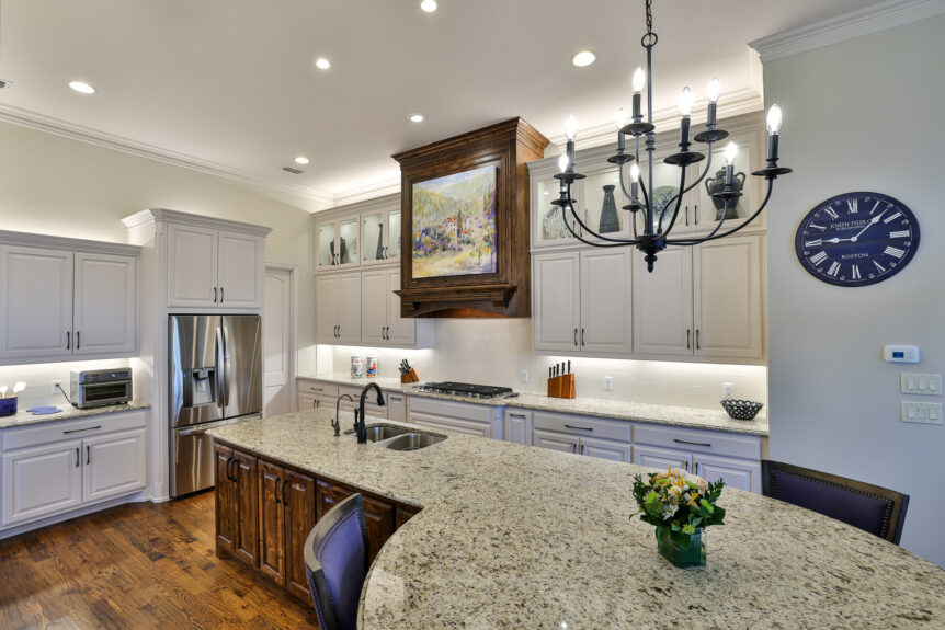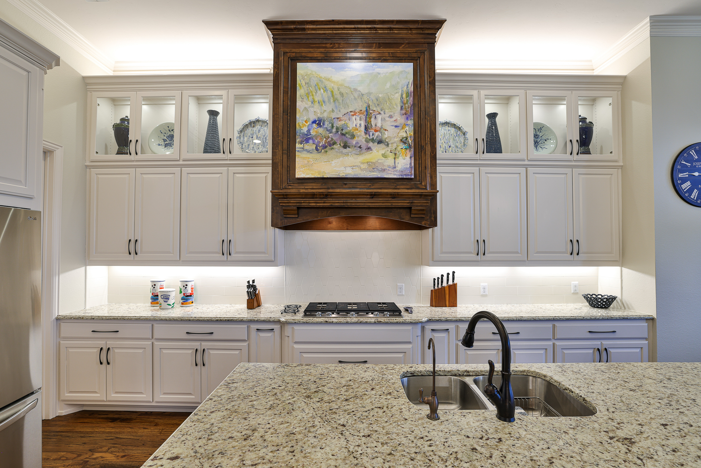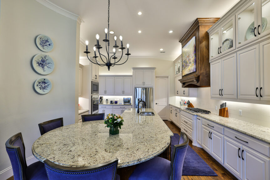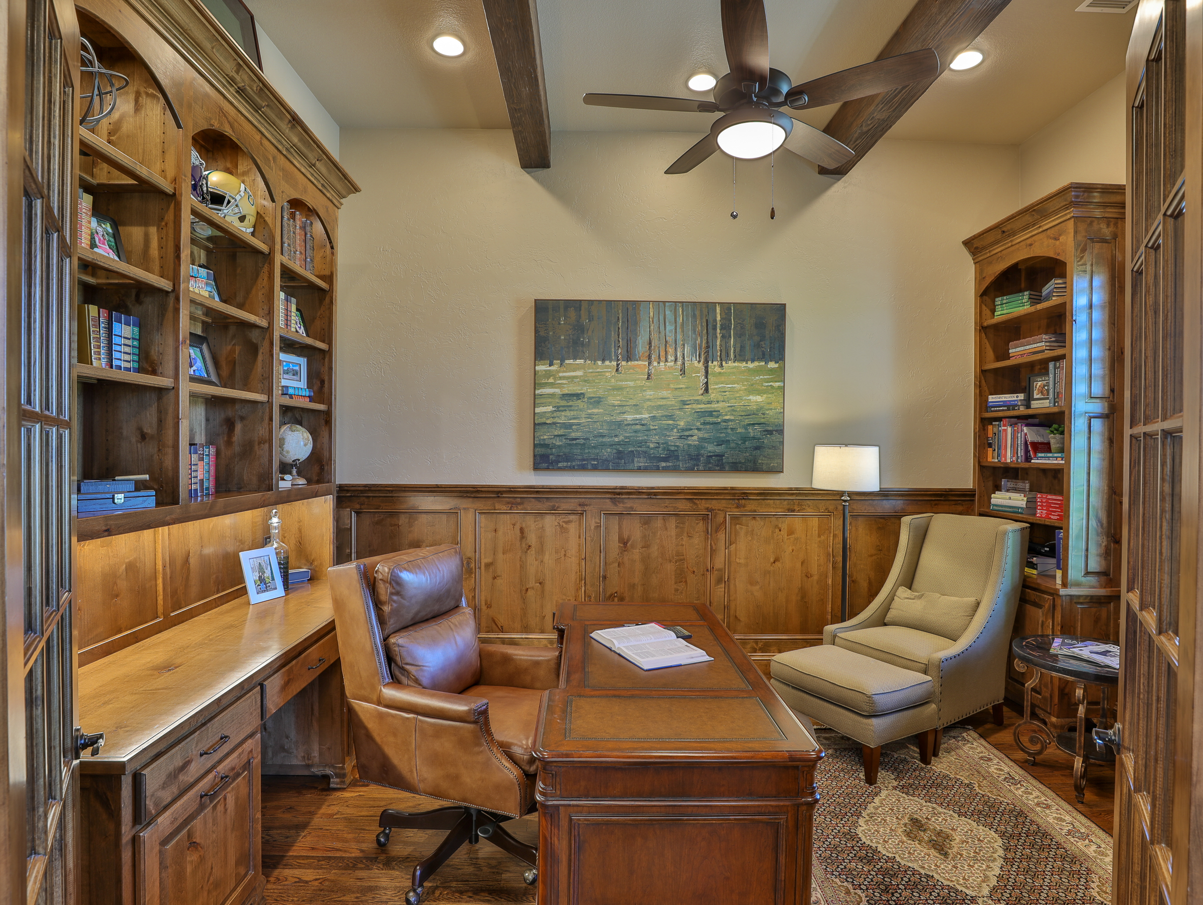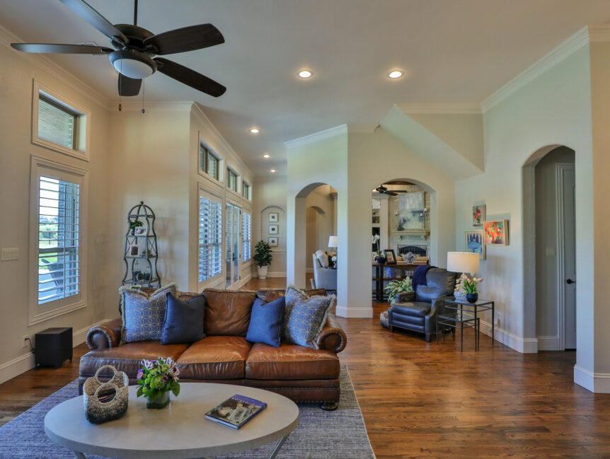 The clients of this transitional style home worked with Ron Parker AIBD and the design build team of the Fred Parker Company to make significant improvements to their home to accommodate the needs of their blended family. The home was completely renovated throughout the foyer, grand room, kitchen, family area, dining room, and study. The two-story grand room was redesigned reducing the ceiling height from 22’ to 12’ to allow space for new upstairs rooms to be added. The room was re-defined with drywall arches creating a beautiful Loggia to the pool. The room was accented with stained wood beams, new entertainment center, and updated fireplace. The Dining Room features an elaborate window pediment and a new wine room with elaborate iron gate. The Foyer was transformed with a groin vault ceiling and the Study was updated with stained built in cabinets, wainscot paneling and decorative stained beams.