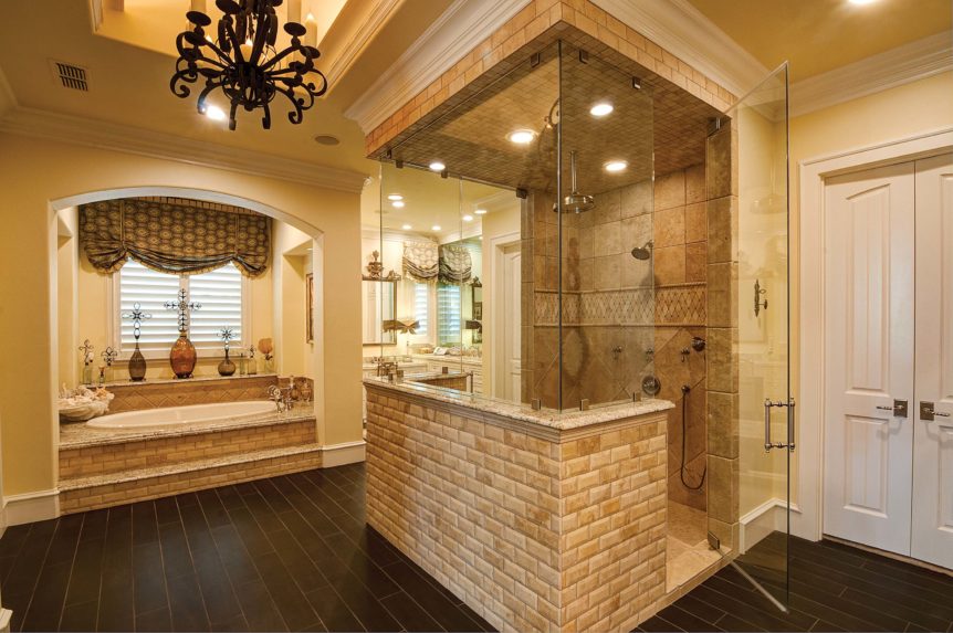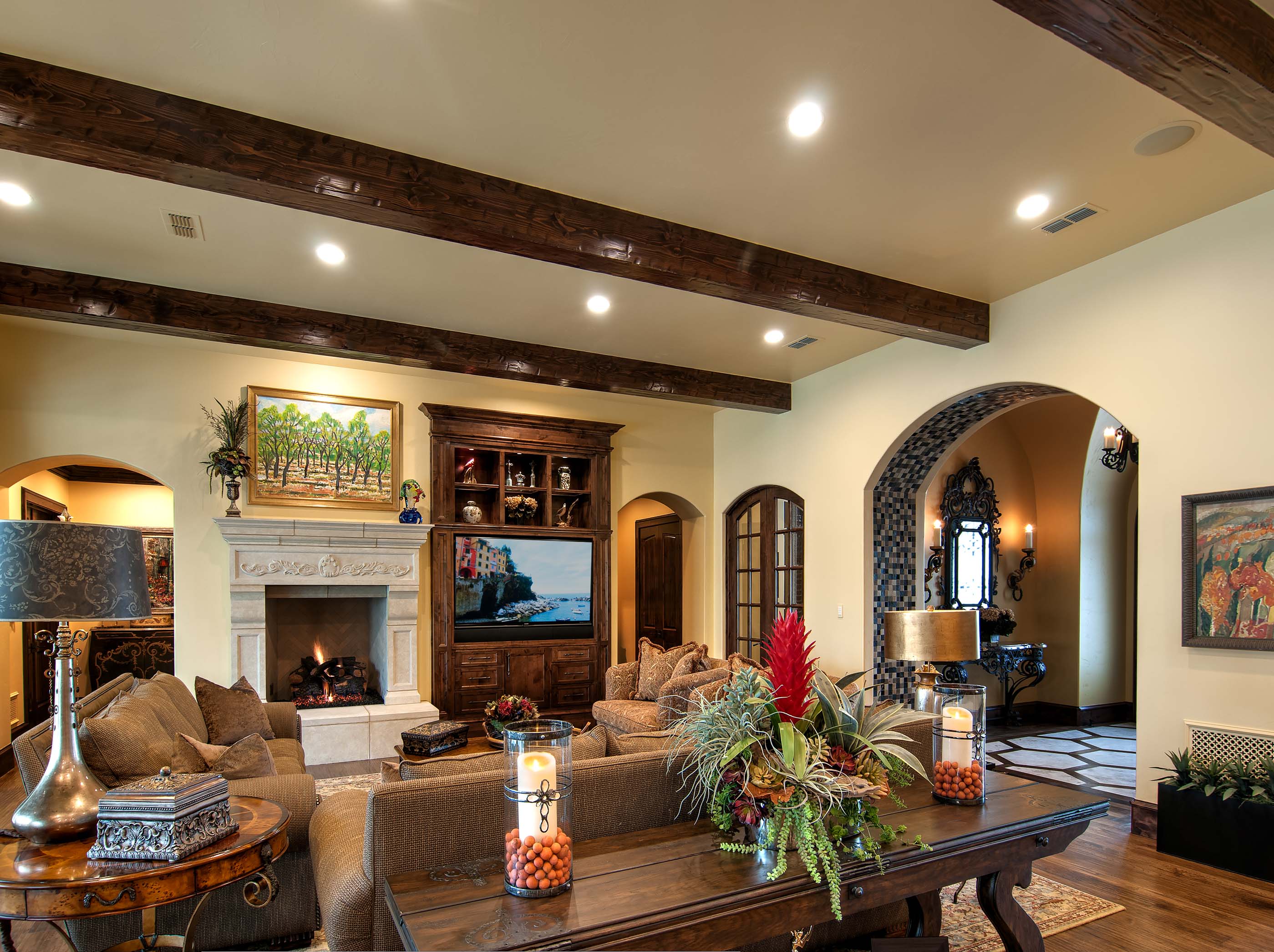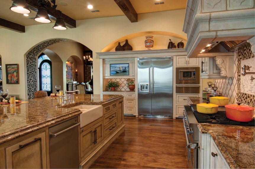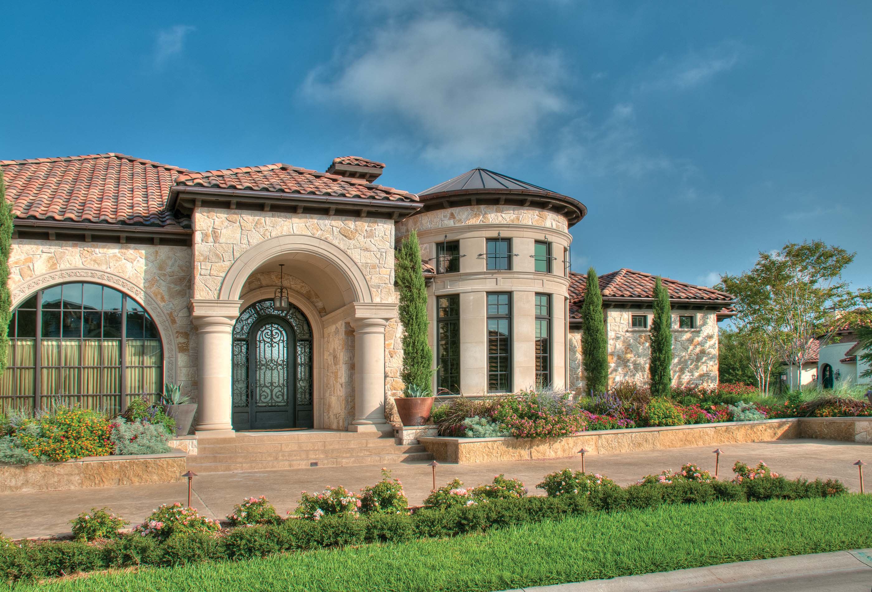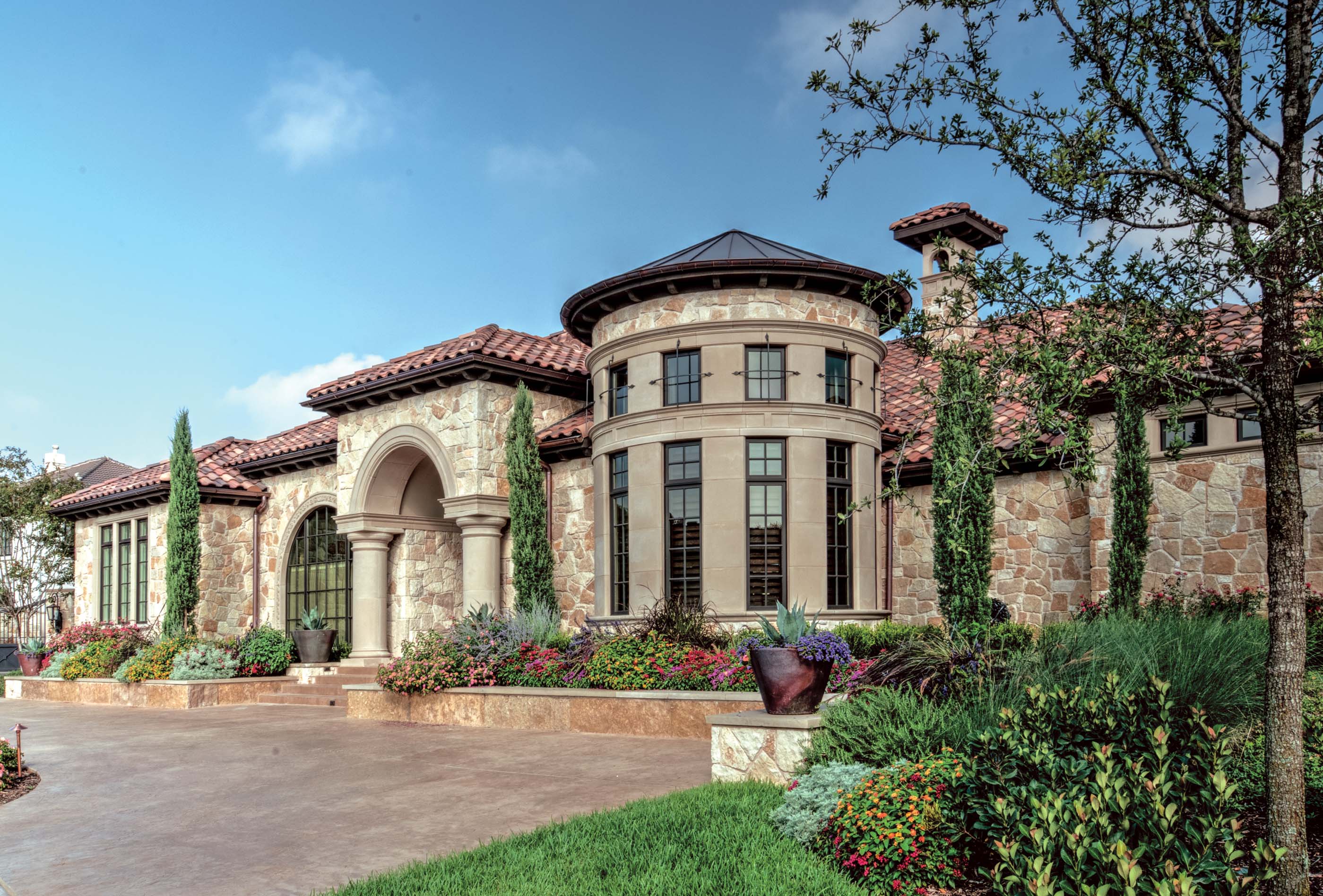 Builders Ron and Fred Parker worked with this client, her architect, and her interior designer to create this incredible estate. This was the second large custom home designed and built for this client which features elaborate cast stone details, copper and tile roofing, limestone and stucco veneer, and custom wood windows. The interior is large and spacious with groin vault ceilings, tile inlaid archers and floors, and hickory hand-scraped floors, stained wood beams, and a catering kitchen and wine room.