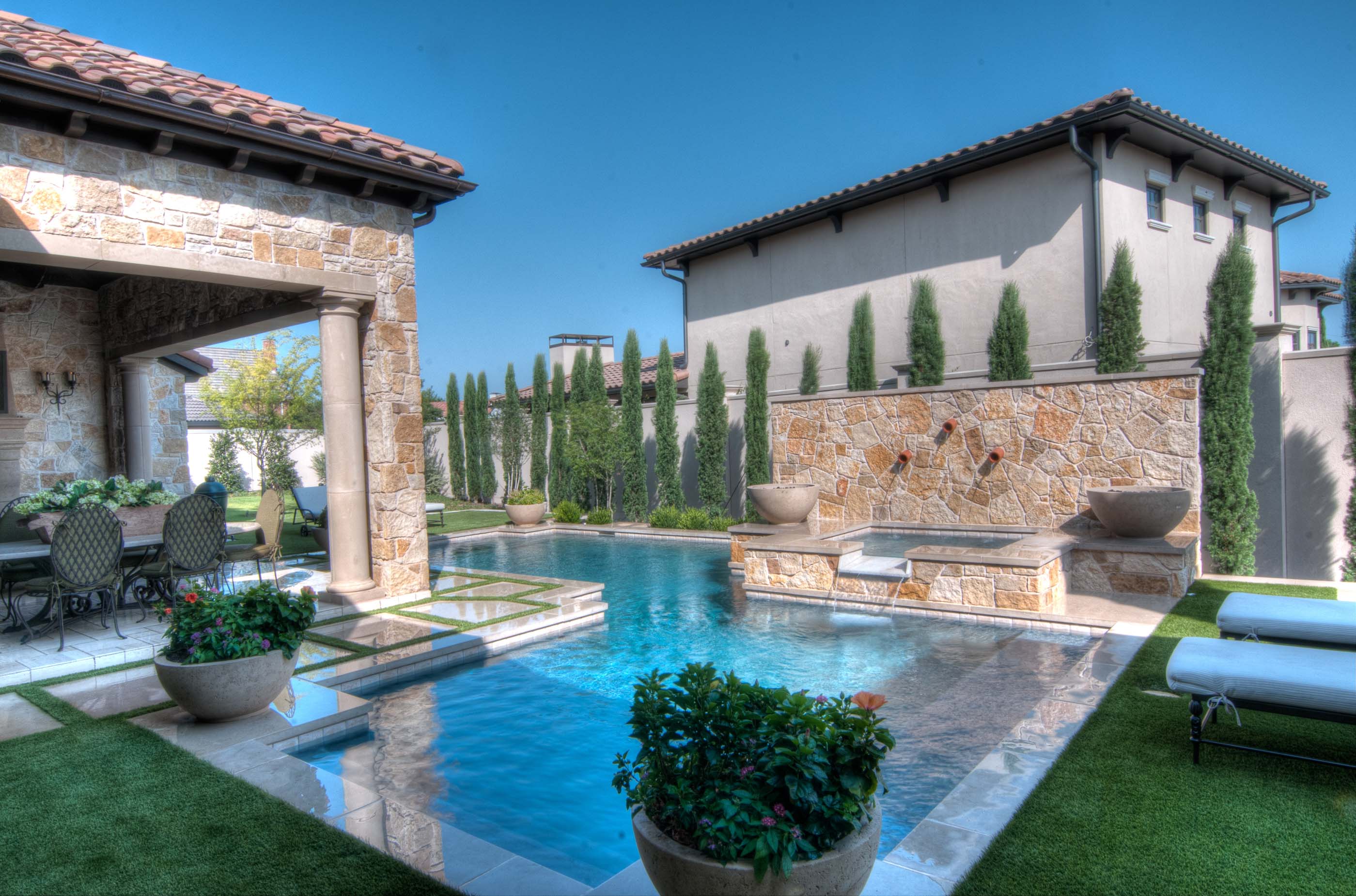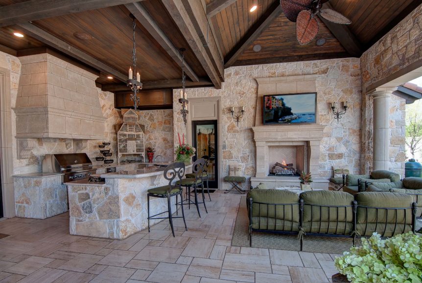 The home has a large Cabana complete with outdoor kitchen, vaulted ceiling, exposed beams, cast stone fireplace, uniquely engineered cast stone columns and entrances with limestone floors. The unique swimming pool was designed with an elevated spa and water feature, and cast stone fire bowls.