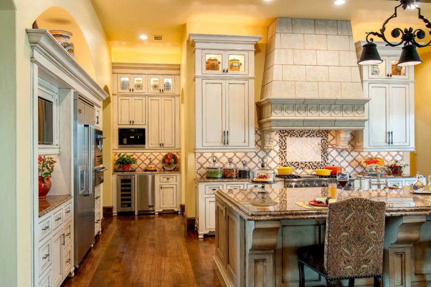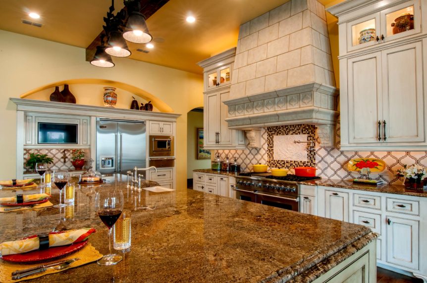 The kitchen features a chef’s oven with elaborate cast stone hood with corbels, granite countertops, tile back splash, shaker style cabinetry with beaded reveal, and glazed finish. The exposed wood beams and hickory wood floors extend from the living and dining room through this elegant kitchen.
